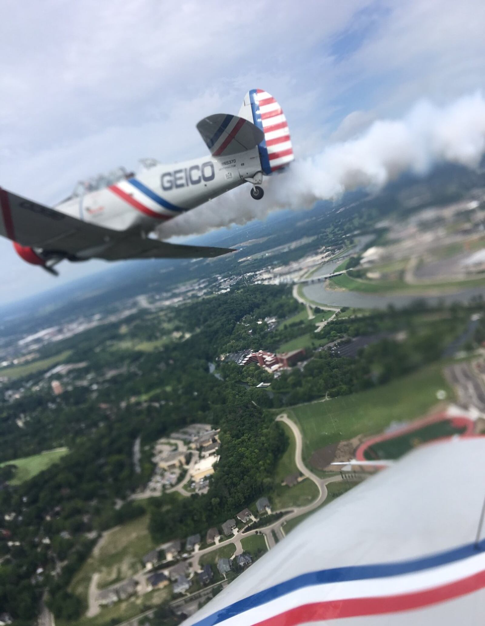 On all sides of the plane, identical vintage aircraft flew just feet away from us — cruising above and below in a methodical formation practiced many times by the squadron.With blue skies, the team cruised from the airport in Vandalia to downtown Dayton. From the back of this aircraft, the movement seemed effortless — one well-practiced dance by the pilots.