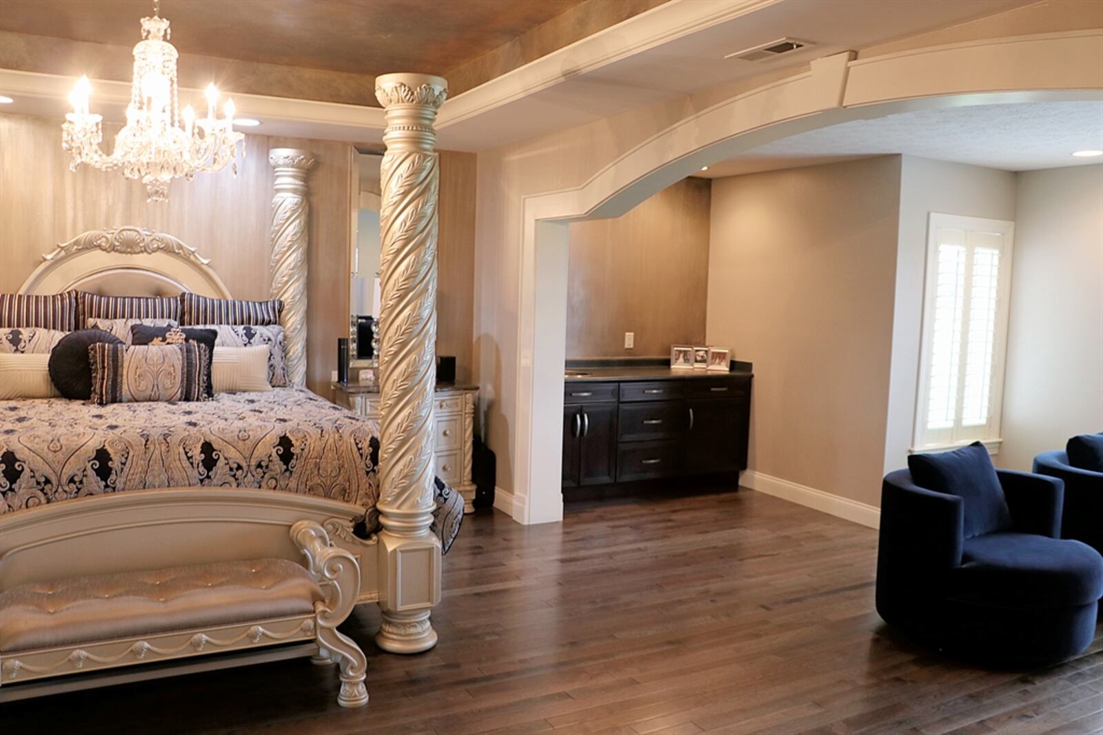 Upstairs, three bedrooms and two full bathrooms are located. The staircase ends within the loft with wood-plank flooring that continues across the catwalk and into the primary bedroom suite. The owner’s suite has a tray ceiling, a wet bar and a spacious sitting room. Double doors open into the full bathroom with two separate single-sink vanities, one of which has an extended make-up desk. A window is above the wide, whirlpool tub which is flanked by columns and has a mosaic-tile step entrance. The walk-in shower includes body jets and multiple shower heads. There is a walk-in closet divided by built-in countertops, drawers and storage nooks.