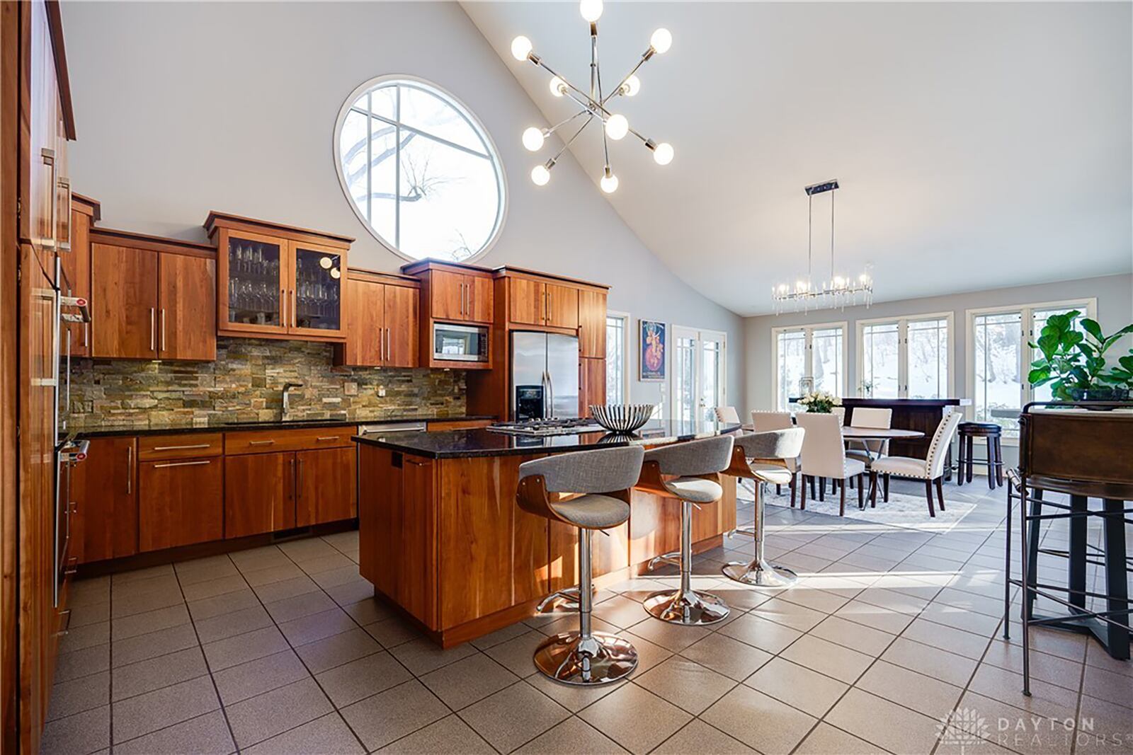 The kitchen is two steps up from the dining room and has tile flooring, cherry wood cabinets, granite countertops and a tile backsplash. There is a decorative chandelier on the vaulted ceiling. There is also a circular window above the cabinets and an opening from the second floor overlooking the kitchen. Appliances include a side-by-side refrigerator, double wall ovens, a microwave, and a gas cooktop on the island. The island also has a wine/beverage cooler. The breakfast area at the end of the kitchen has tile flooring, a decorative chandelier and a wall of windows. French doors on both sides lead to the rear patios.