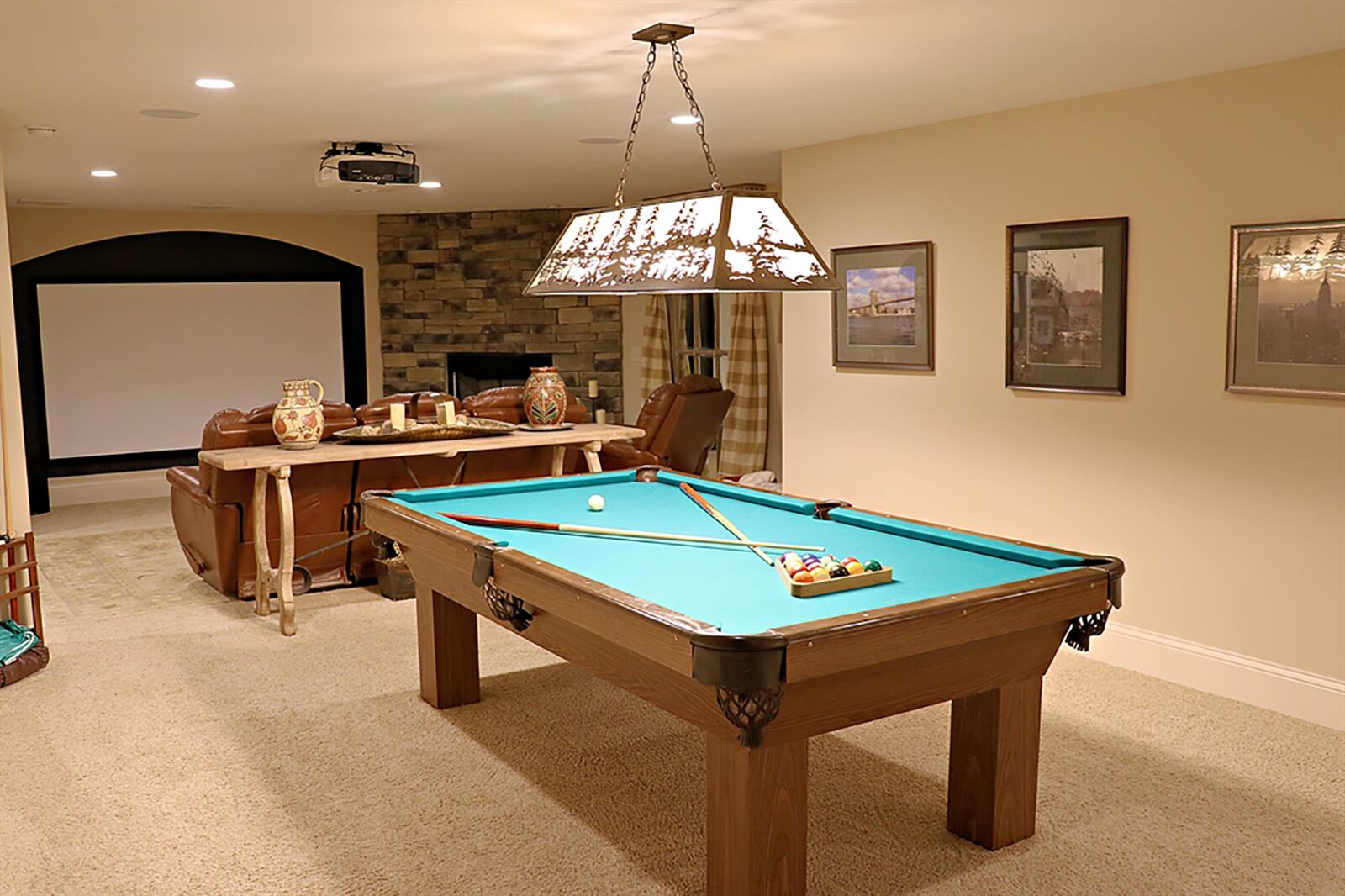 The open stairwell from the foyer leads into the finished lower level, which includes an open floor plan with space for a media area, game space and wine-tasting station. A stone, gas fireplace is tucked into one corner, and a full-wall screen is built-in for the projection system.