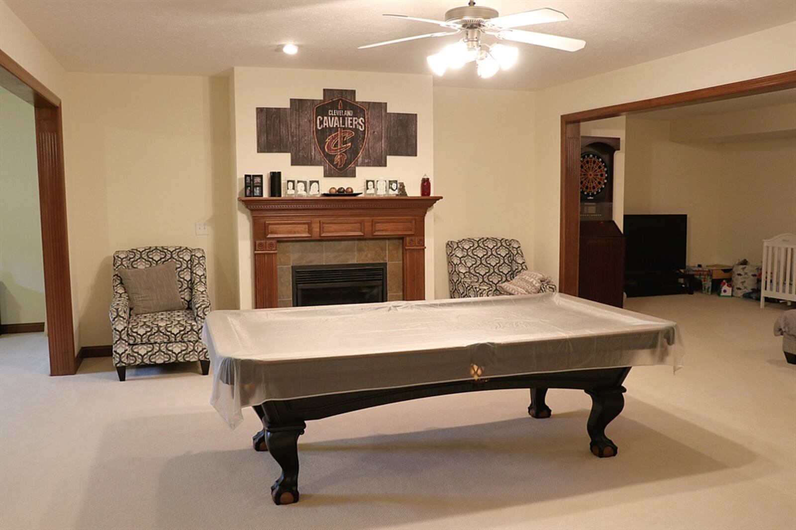 Wooden spindles accent the open stairwell to the lower level. The stairwell opens into a large space divided into three possible settings — including a family room, media room and recreation room. A gas fireplace with tile hearth and wood mantel is at the center of the family room and can be enjoyed from all three areas. The recreation room has the double glass patio doors that open out to a small side-yard patio.