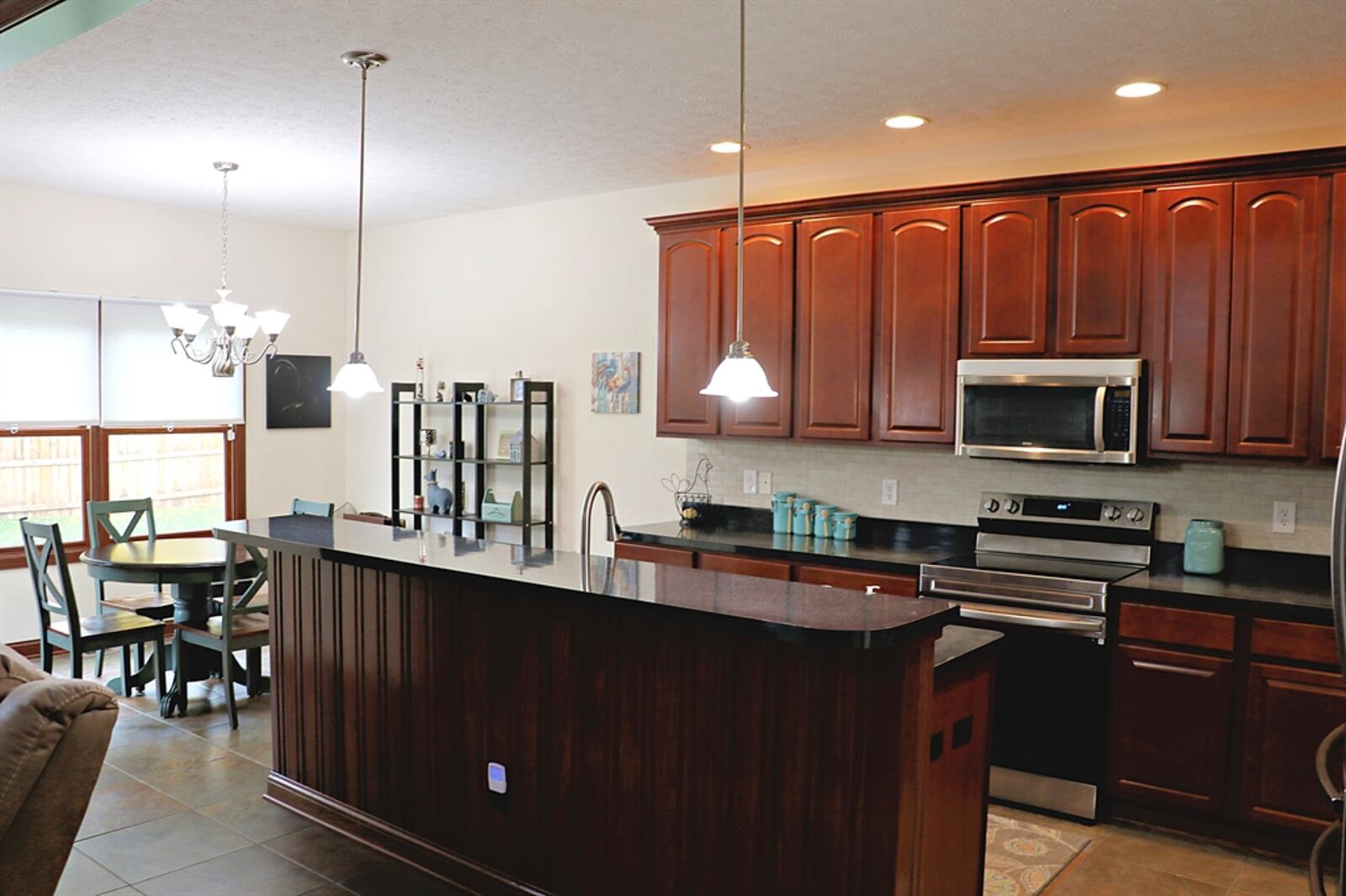 Dark granite counters complement the 42-inch cherry cabinetry of the gourmet kitchen. A spacious island has two counters with an extended high top for bar seating and ample preparation space with sink within the lower counter. Additional cabinetry, some with glass-panel doors, fills two walls and surrounds stainless-steel appliances including the range, dishwasher and microwave. Hanging light fixtures are above the island and match the fixture above the breakfast room. A glass door opens from the breakfast room to the backyard.