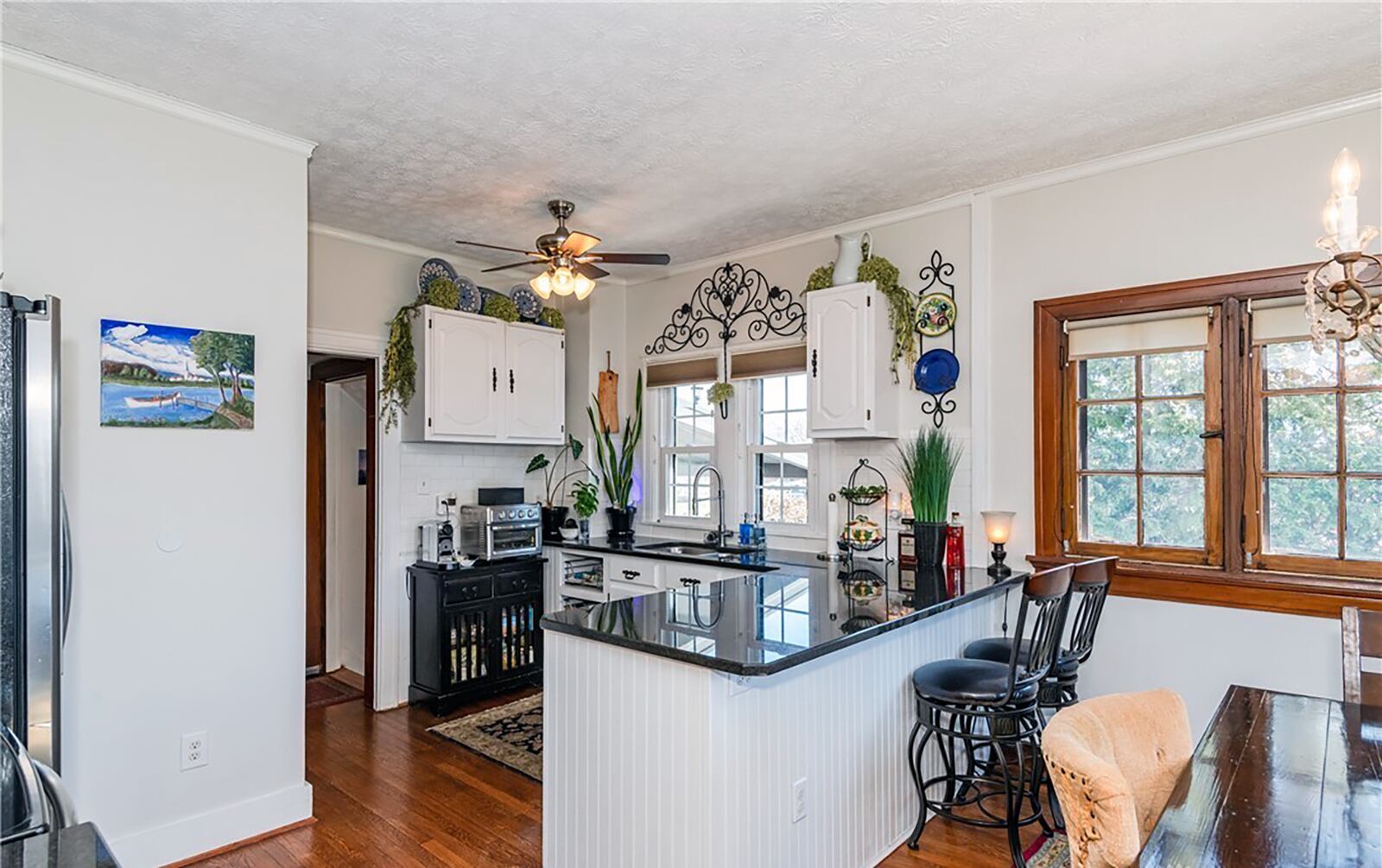 The living room is open to the kitchen and dining room. The dining room has hardwood flooring, a decorative chandelier with medallion, and crown molding. The kitchen also has hardwood flooring, a ceiling fan, updated white cabinets with granite countertops, tile backsplash and a breakfast bar. Appliances include a stainless range, microwave, and a side-by-side refrigerator.