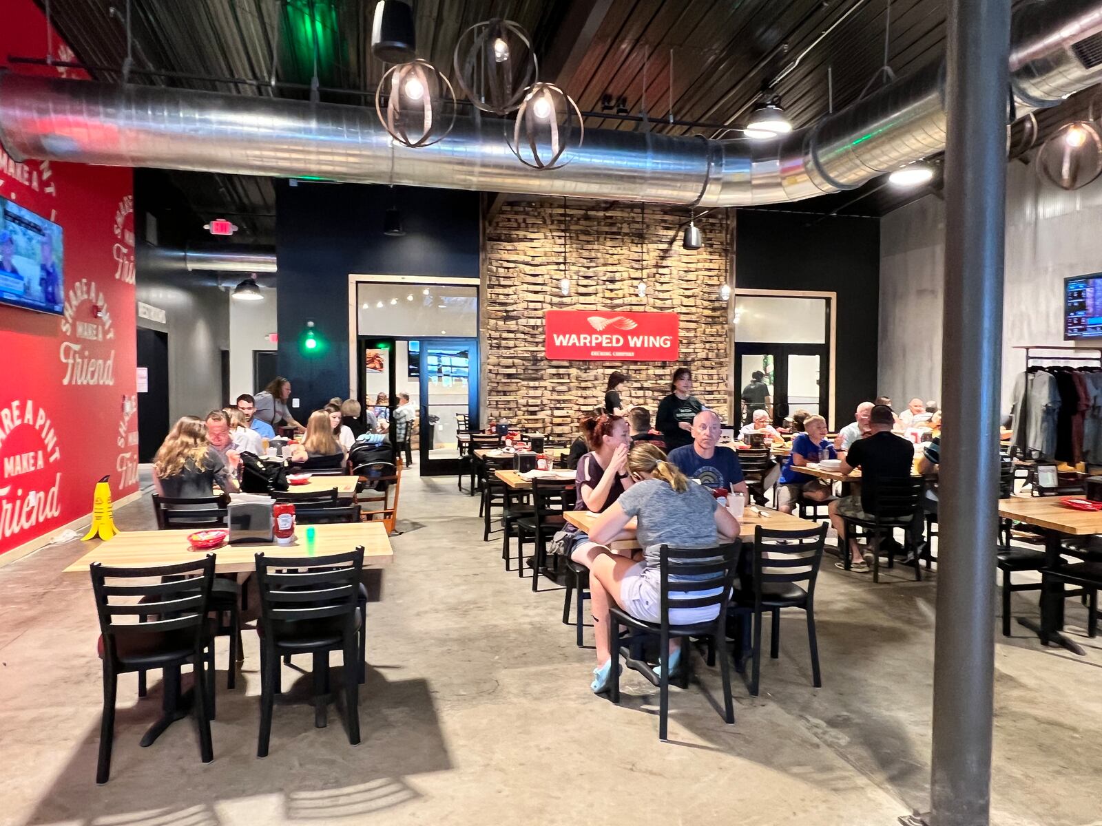 The restaurant has seating for 127 in the main part of the restaurant and 104 on the dog friendly patio. There is also an event space that can accommodate parties up to 48 people. The location also features warehouse and and production space with a pilot brewing system to allow for brewing smaller exclusive batches of beers that can be featured at Warped Wing taprooms.