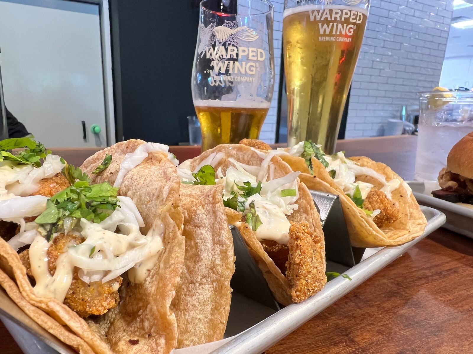In addition to Warped Wing’s full menu of beers on tap there are also a selection of hard seltzers, ciders, wines and specialty cocktails as well as mocktails and housemate sodas. There’s also beer to go including a peach mango seltzer and a lime ginger seltzer.