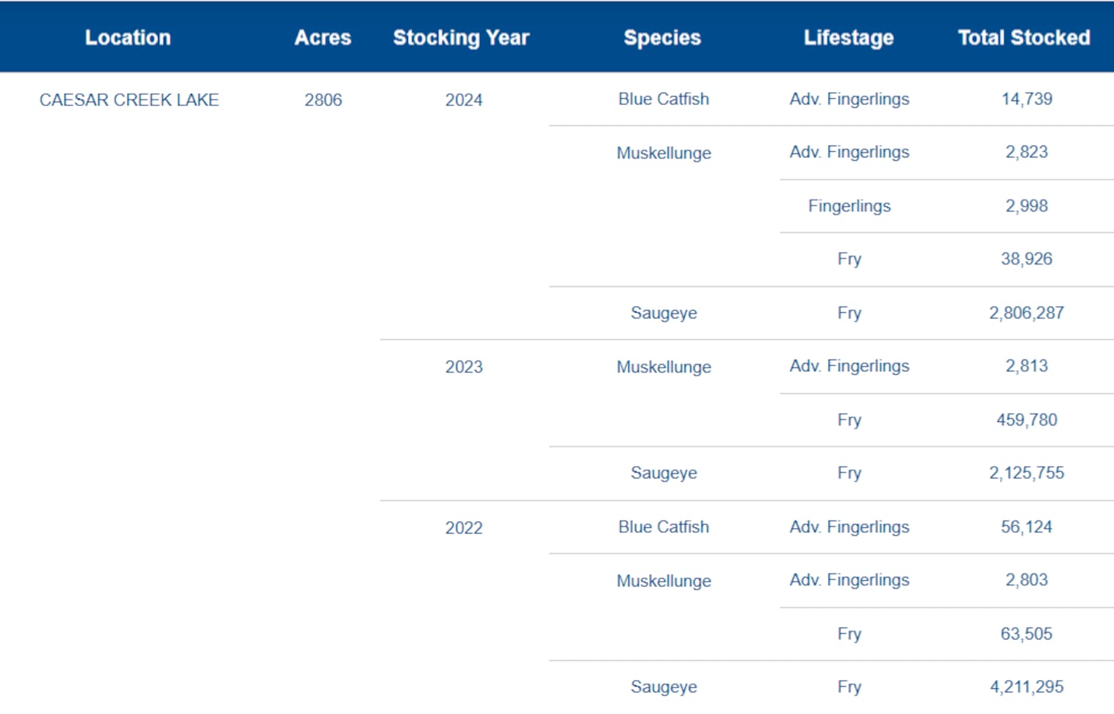 Caesar Creek the stream might not support a fishable muskellunge population. Caesar Creek Lake can support an apex predator such as the muskie.