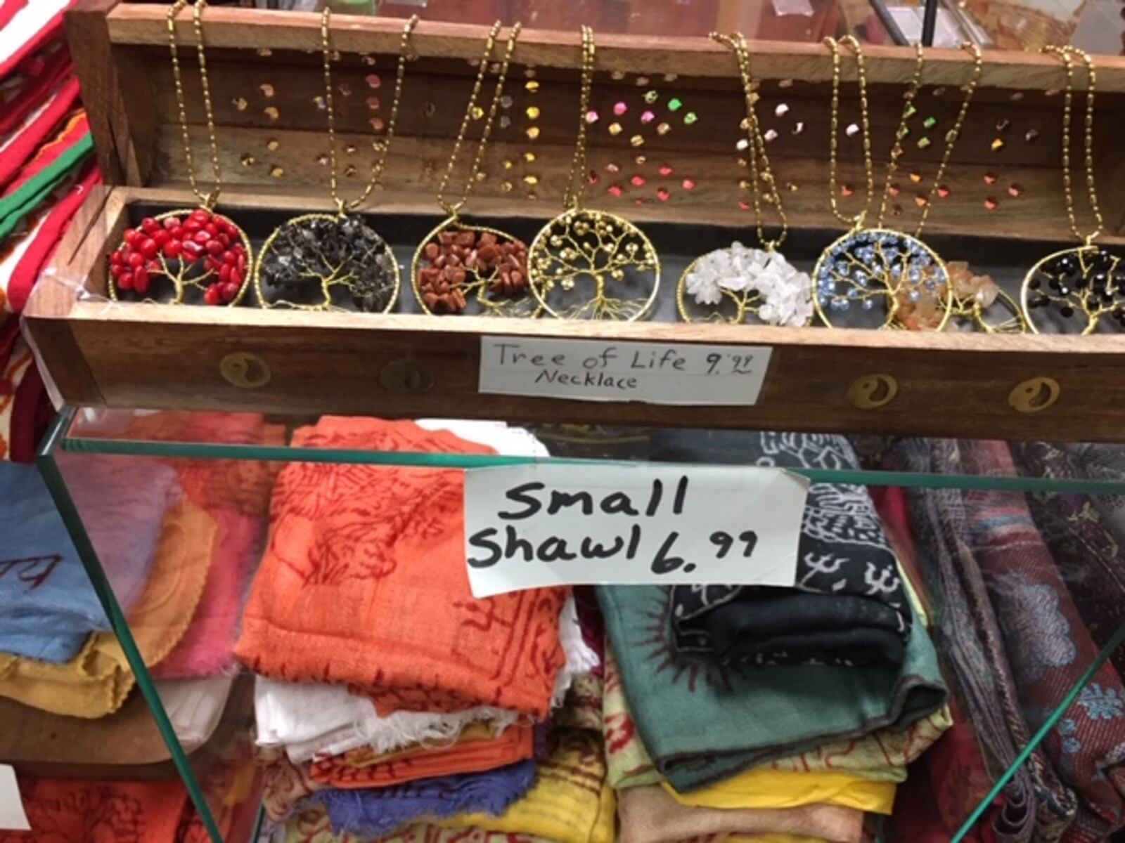 Shawls for $6.99 and tree of life necklaces for $9.99.