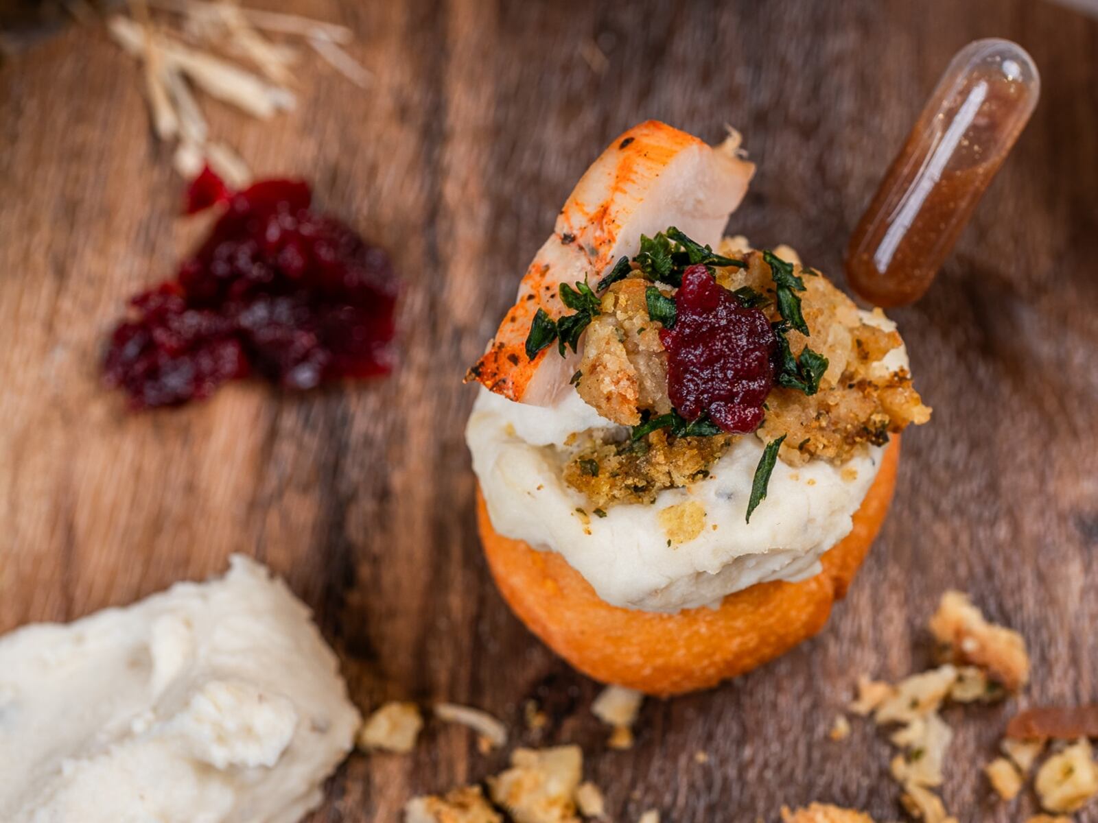 - Thankful as Cluck (a donut loaded with mashed potatoes, herbed stuffing, a slice of turkey, cranberry sauce and a pipette of gravy)