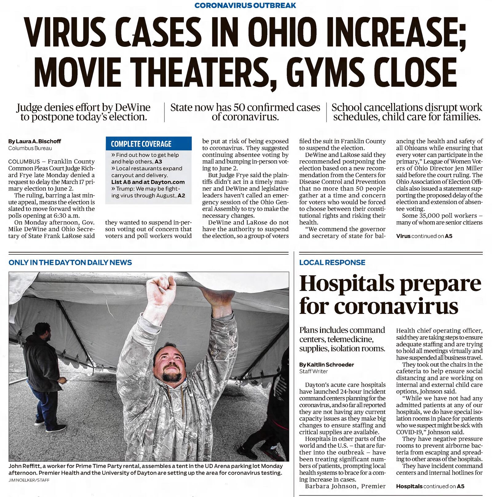 Fifty cases of coronavirus were confirmed in Ohio. DeWine and Ohio Department of Health Director Amy Acton order bowling alleys, movie theaters, indoor water parks, indoor trampoline parks, fitness centers, gyms and recreation centers to close. Acton issues a public order in the evening closing Ohio’s polling locations. Public gatherings are limited to 50 people.