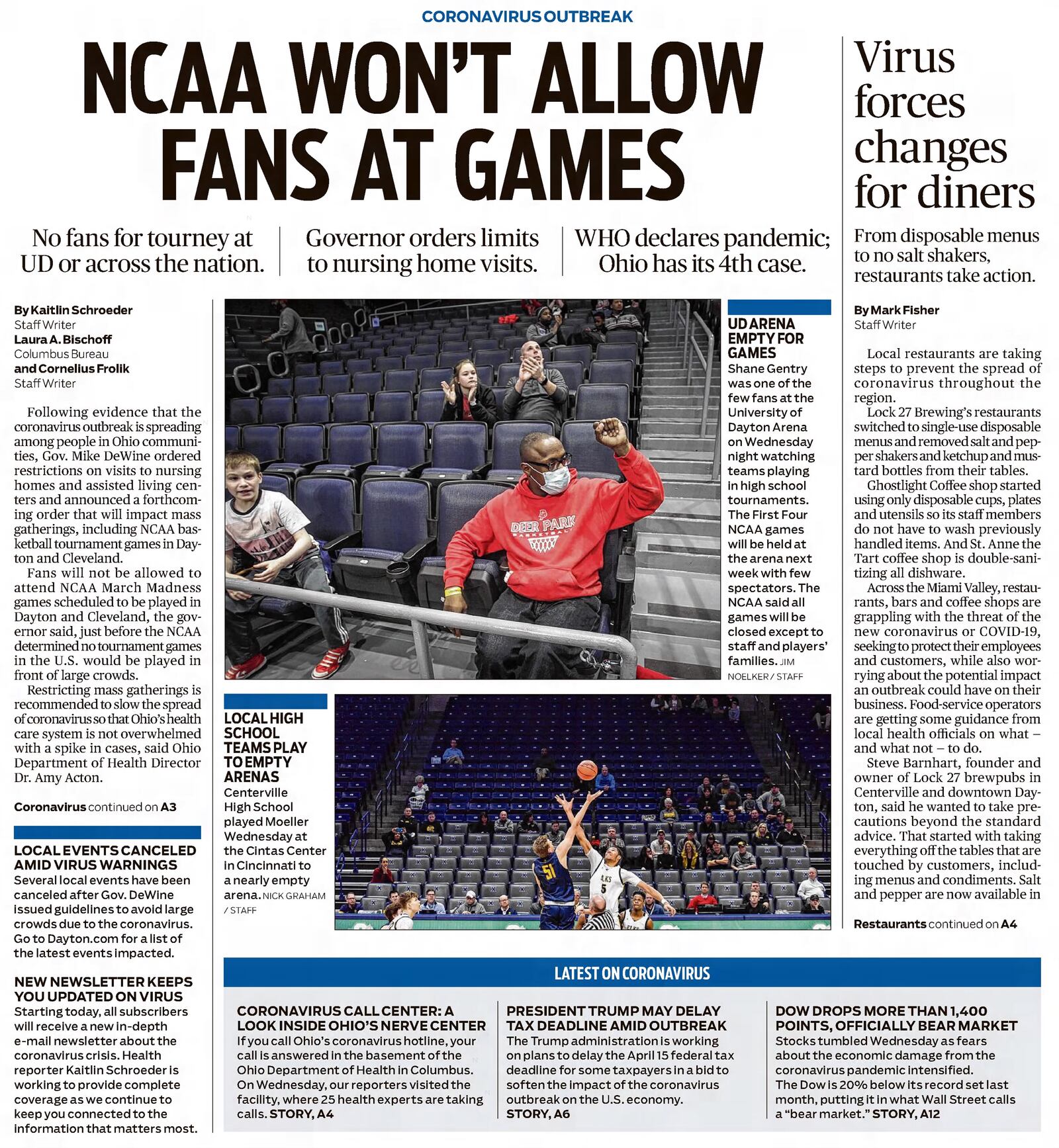 In an effort to slow the spread of the coronavirus outbreak, Gov. Mike DeWine asked organizers of indoor sporting events — including NCAA March Madness games — to ban spectators, communities to cancel parades and other large gatherings and nursing homes to screen visitors.