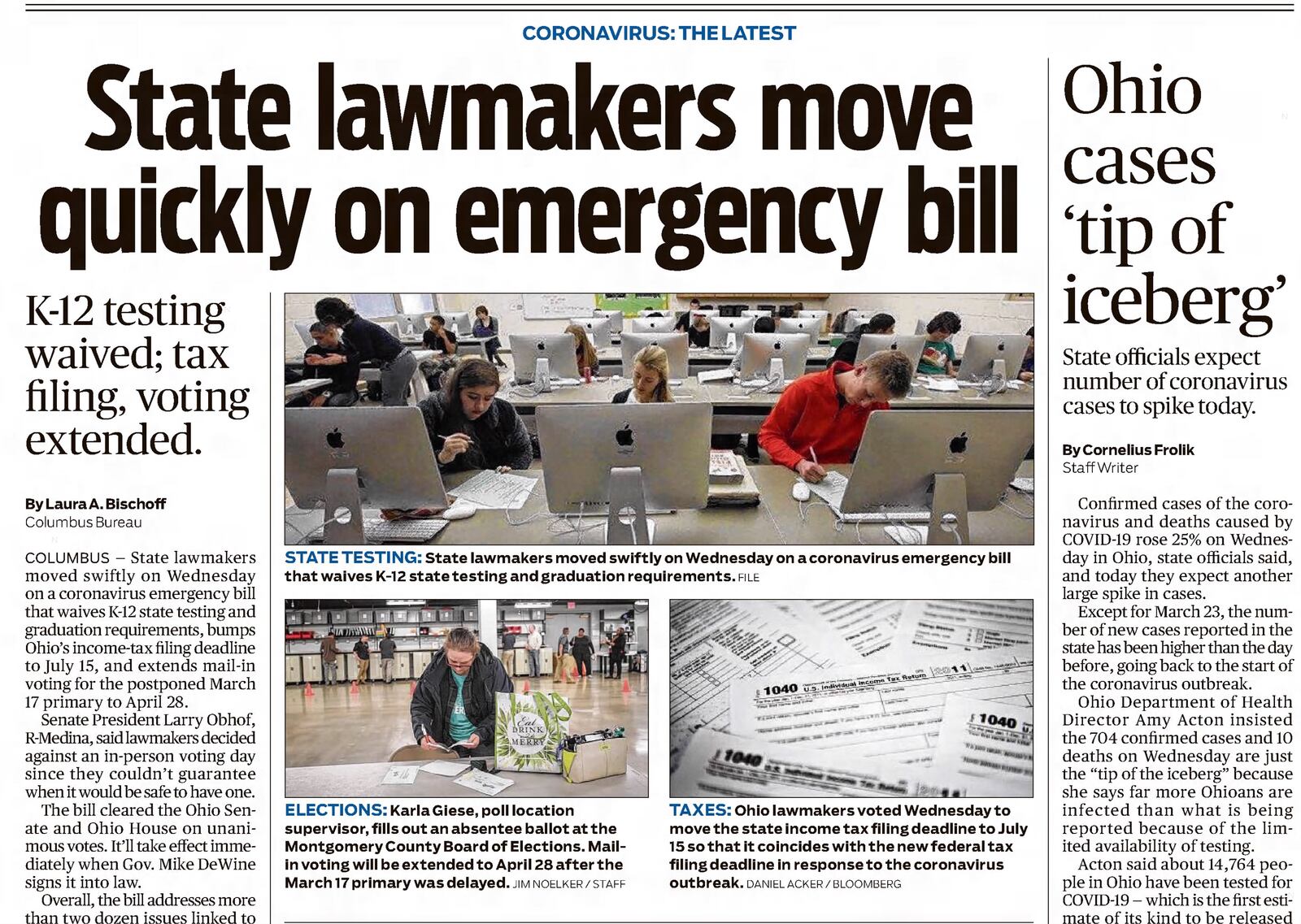 State lawmakers moved swiftly on a coronavirus emergency bill that waives K-12 state testing and graduation requirements, bumped Ohio’s income-tax filing deadline to July 15, and extended mail-in voting for the postponed March 17 primary to April 28.