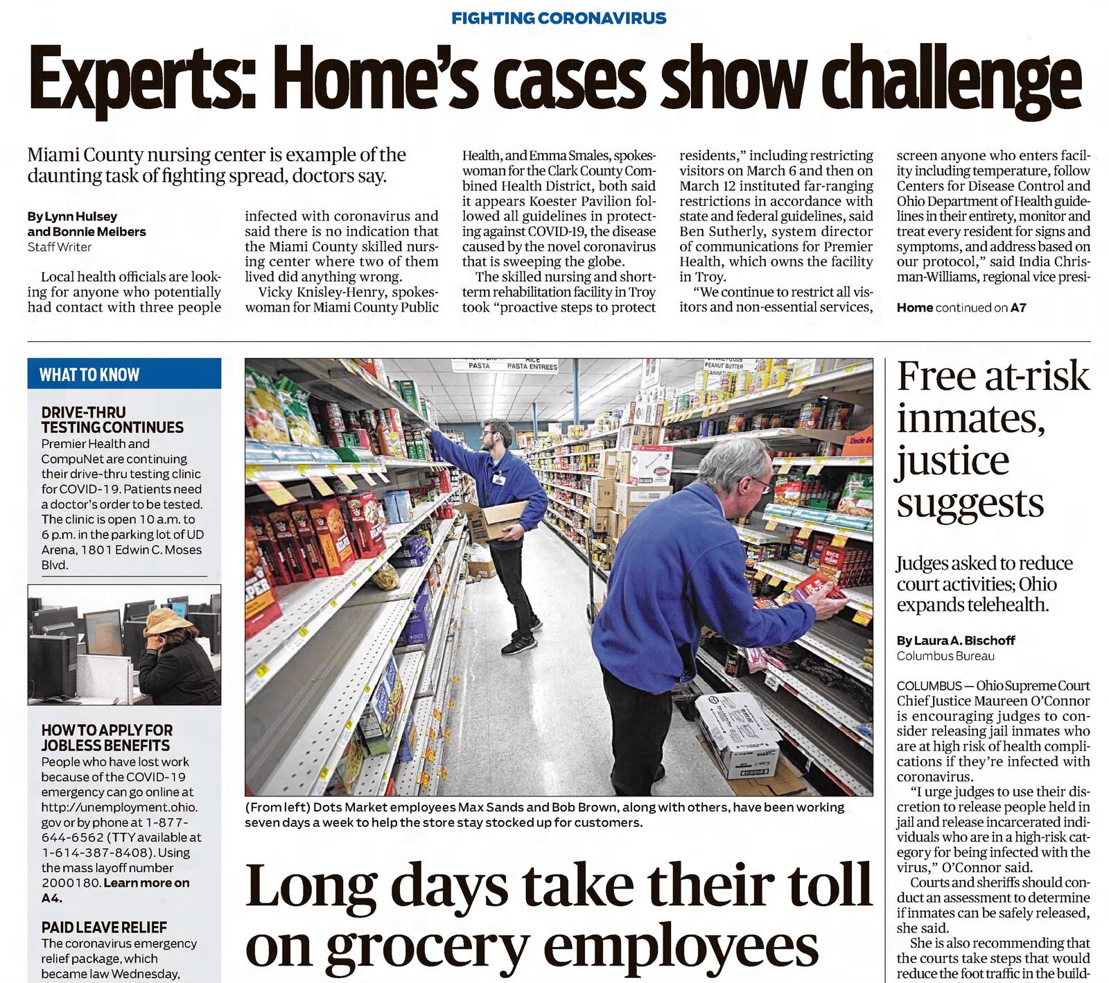 Dayton-area grocery store employees worked long, arduous hours as customers — some irate — rushed to build up their food supplies in reaction to the COVID-19 pandemic.