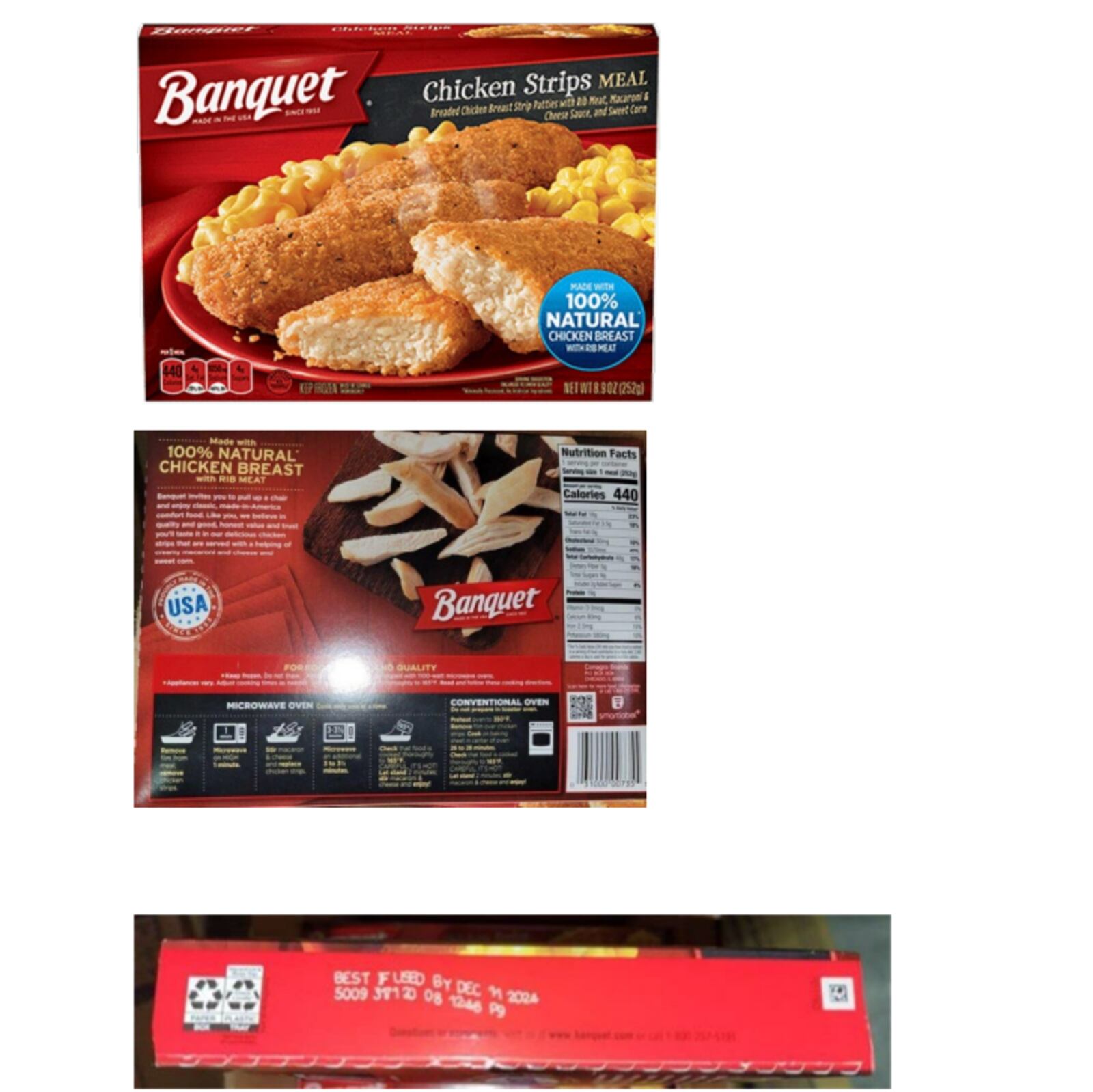 - 8.9-oz. carton containing one entree of “BANQUET CHICKEN STRIPS MEAL” with best if used by “DEC 11 2024,” “JAN 01 2025,” or “JAN 07 2025″ and lot numbers 5009317120, 5009319220, or 5009319820 located on the side of the carton.