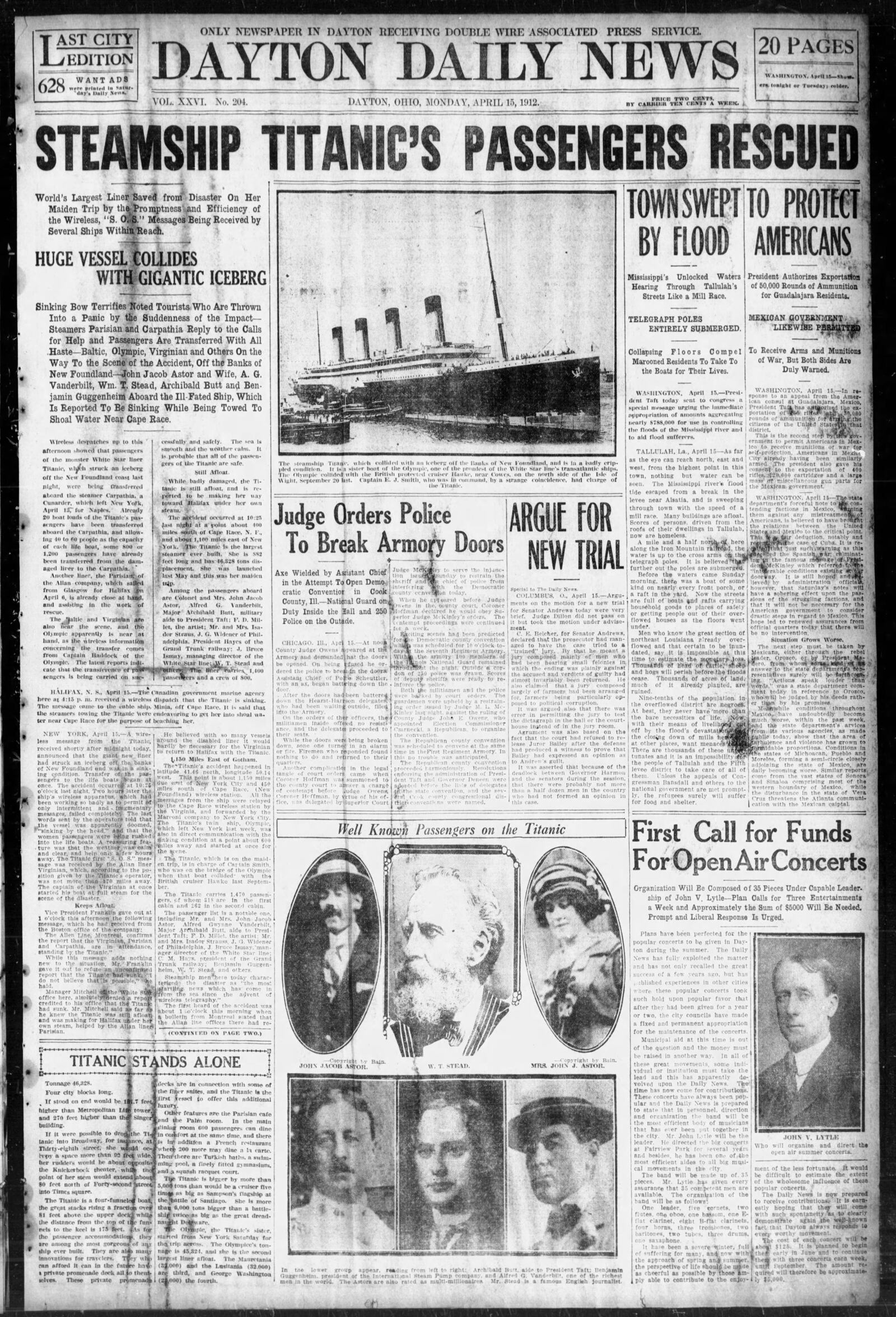 The front page of the Dayton Daily News covering the aftermath in the Great Dayton Flood of 1913.