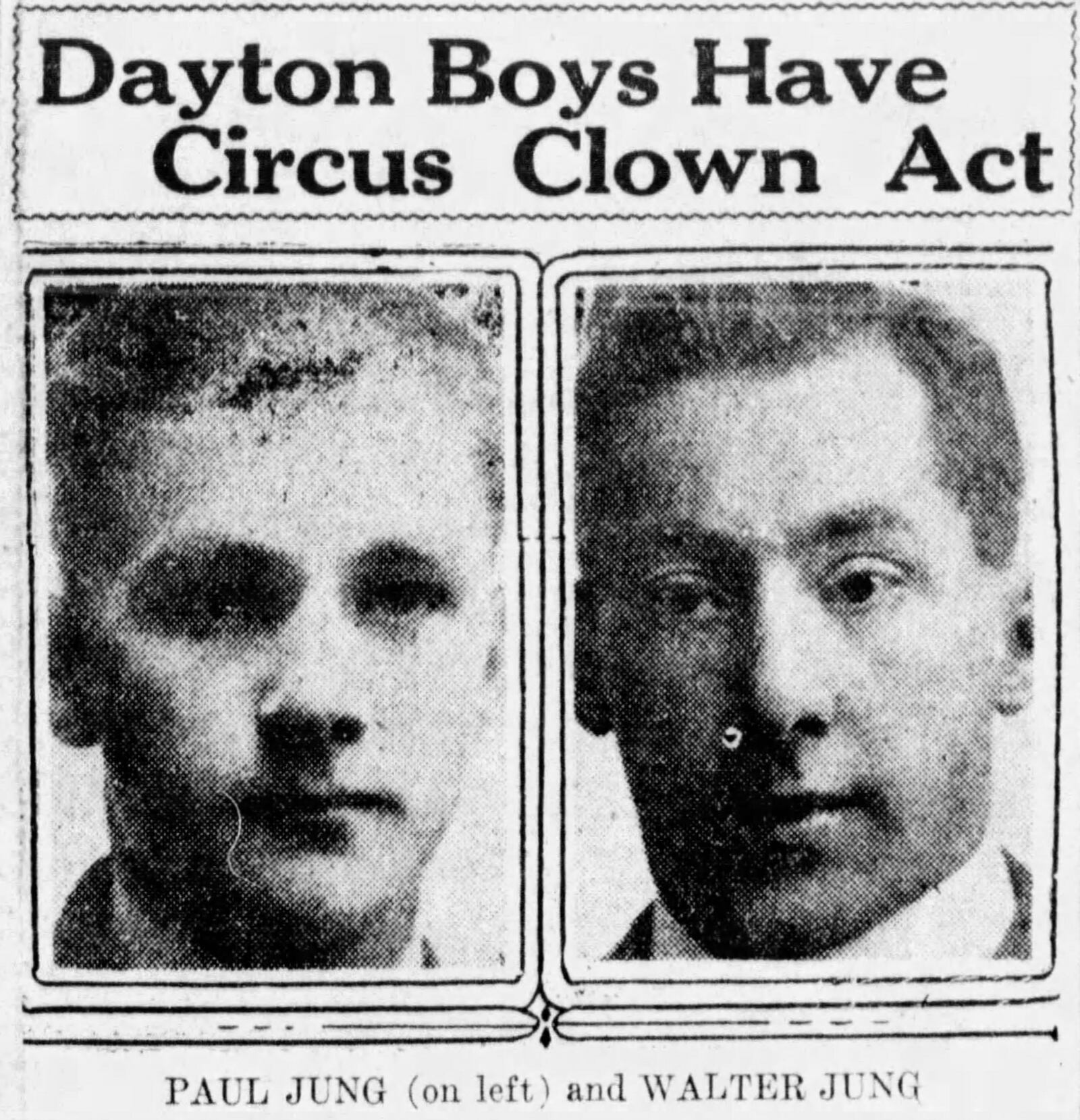 Paul’s brother, Walter Jung, was also a circus clown. A Dayton Daily News article written about them in 1919 previewed that the circus was scheduled to make a stop in Dayton. Along with being in the circus together, the two also did vaudeville and comedy motion pictures and were known for their “comedy acrobatic and knockabout act of four people.”