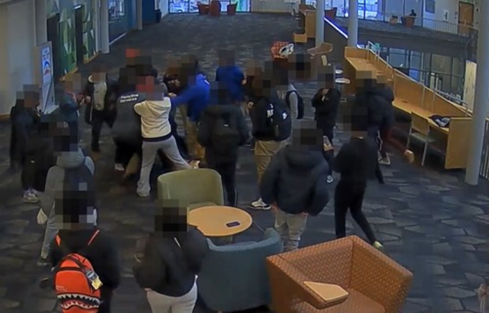 Security video shows people screaming while shoving, grabbing and hitting each other as library staff and security personnel try to break things up.