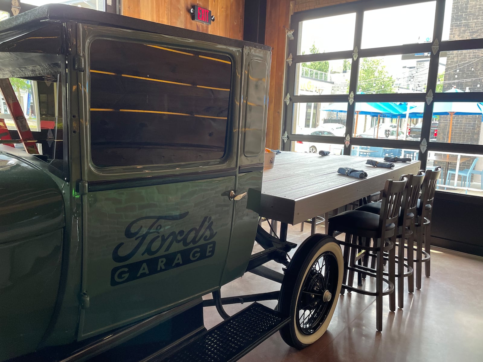 From the Ford Model A hanging above the bar to the napkins featuring shop towels wrapped in hose clamps, the restaurant pays attention to the details. It has a 1930s garage feel with a Ford Roadster in the middle of the dining room and two other vintage cars sitting out front of the restaurant with gas pumps. The team wears nostalgic auto shop uniforms and if you’re lucky, you’ll be sat at a table featuring the front of a Model T.