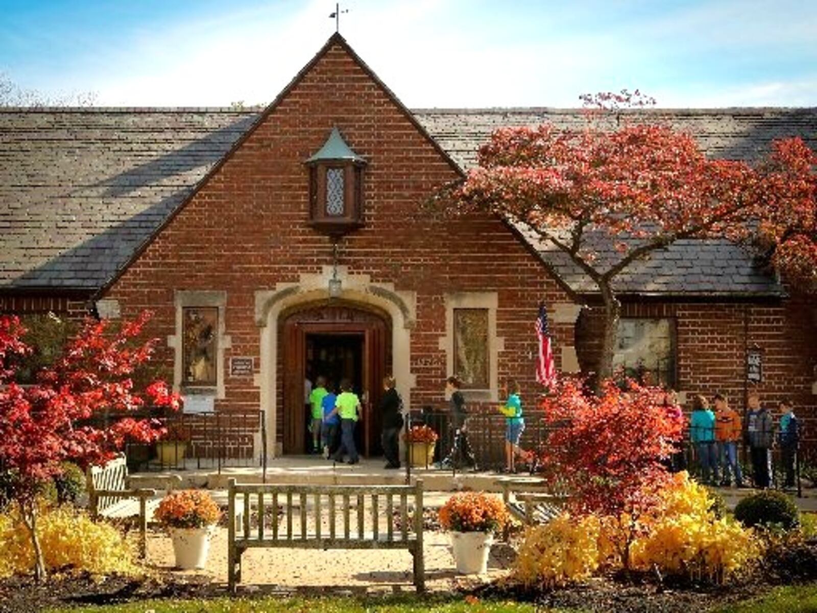 The Tudor revival style building, made of brick and concrete, with stained glass windows and wood shelving, cost $40,000 to build.