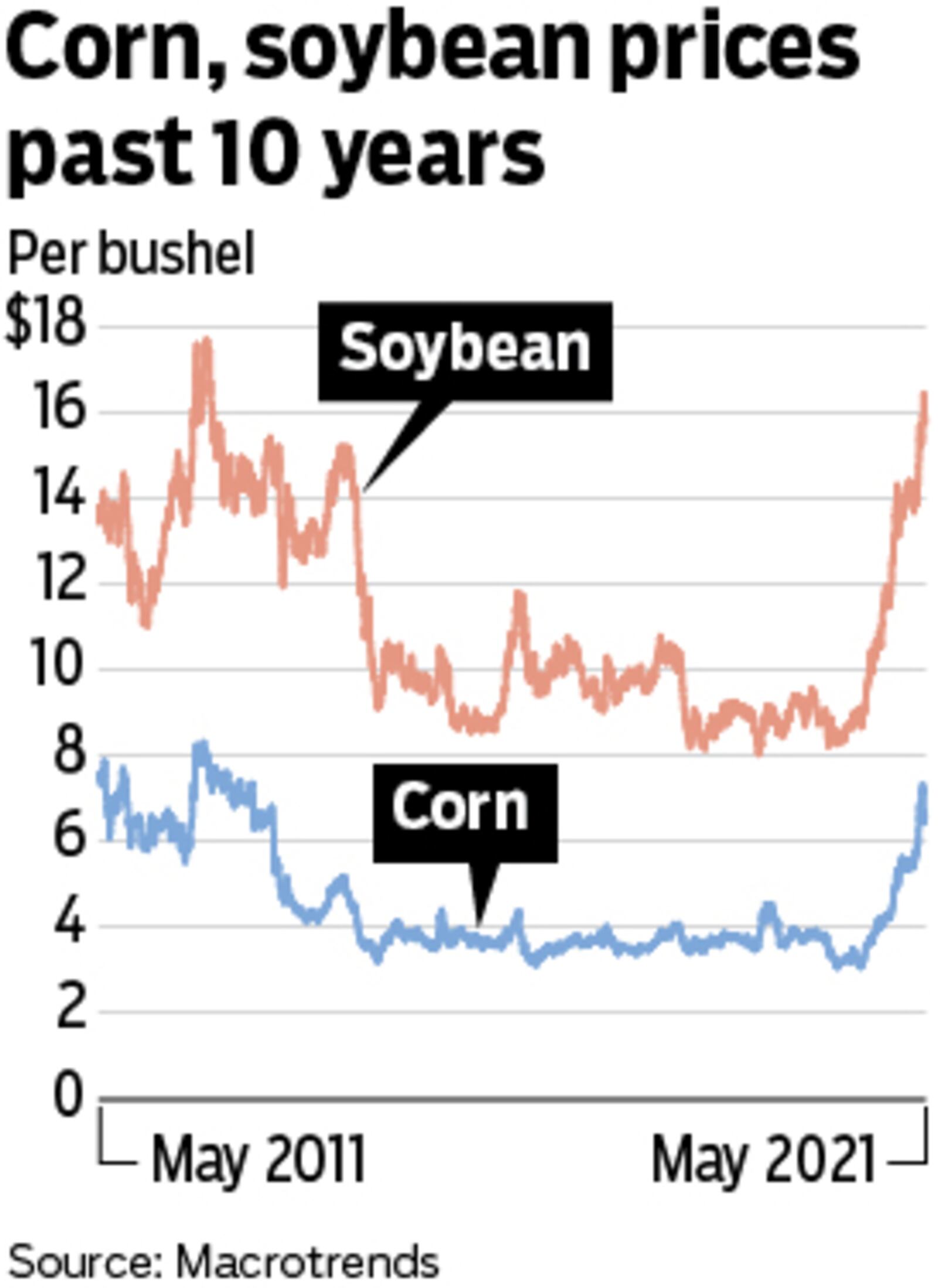Prices for corn have reached $5.72 a bushel and $14.27 a bushel for soybeans. That is up from 2020 closing prices of $3.63 a bushel for corn and $9.53 a bushel for soybeans, according to the USDA. The closing prices are up about 30 percent, Higgins said.