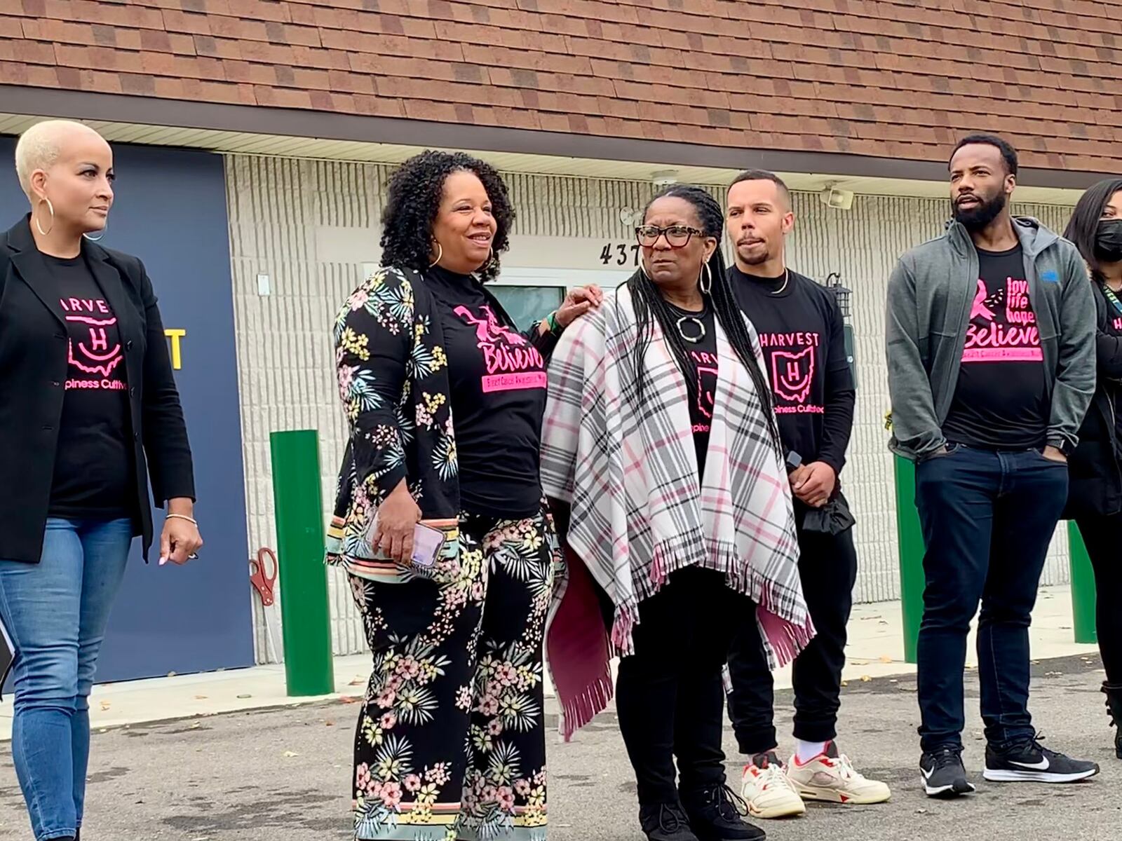 CEO Ariane Kirkpatrick places a hand on the shoulder of her sister, COO Amonica Davis, at the grand opening of Harvest of Beavercreek, surrounded by family members and employees.