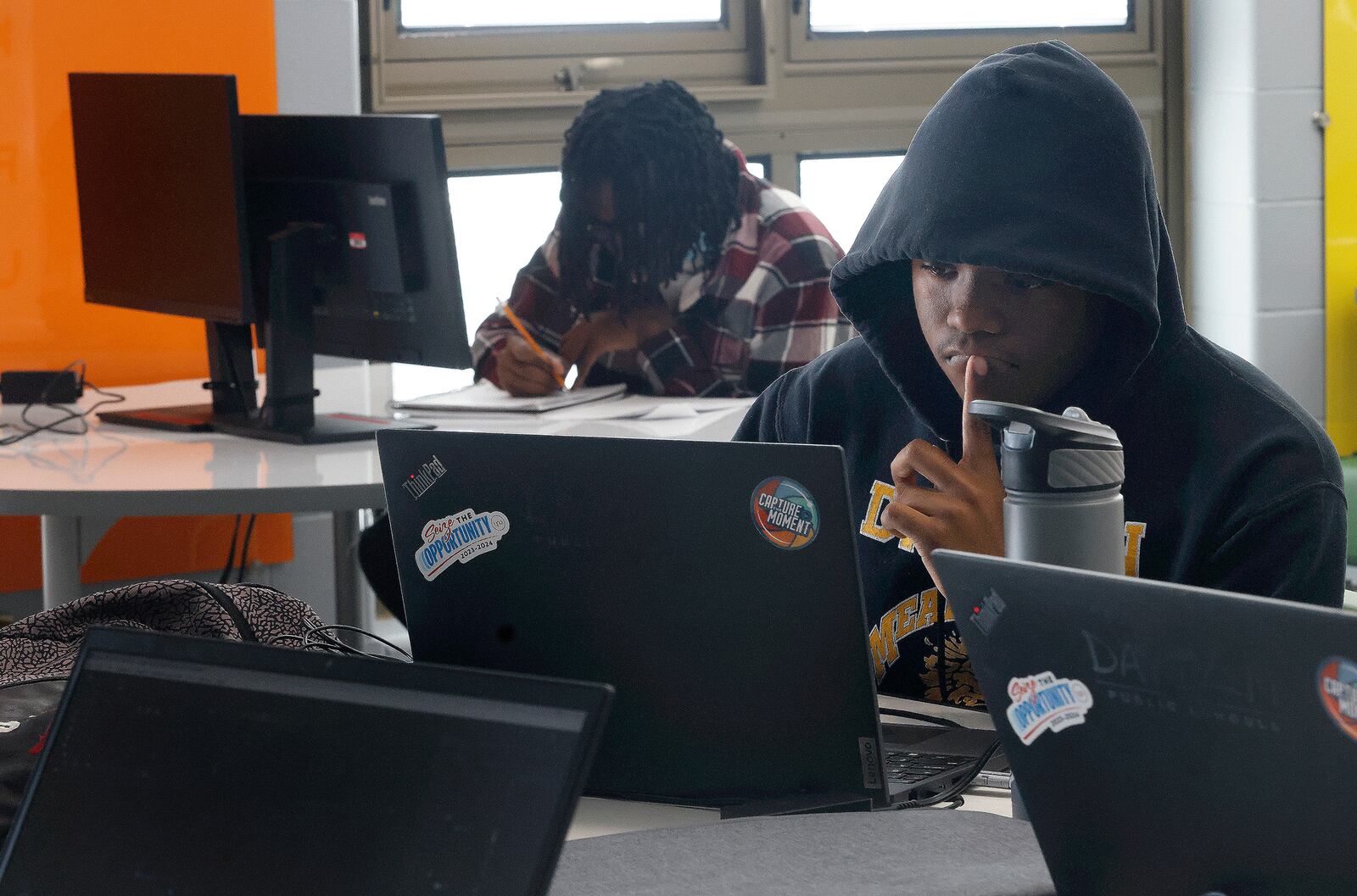 Meadowdale seniors Christopher Morgan and Amirr Landers are part of the robotics engineering pathway. Morgan said he joined the program because he wants to be a mechanic and sees the pathway as a way to get to that goal. Landers said he plans to go to trade school to become an electrician.
