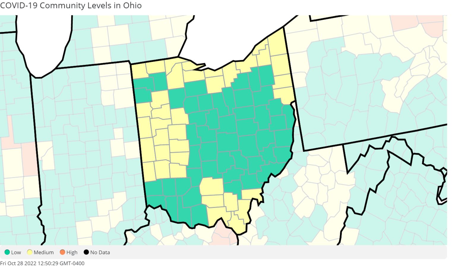 Ohio has 38 counties with a medium COVID community level and 50 at low, according to CDC data. There are no Ohio counties with a high COVID community level.