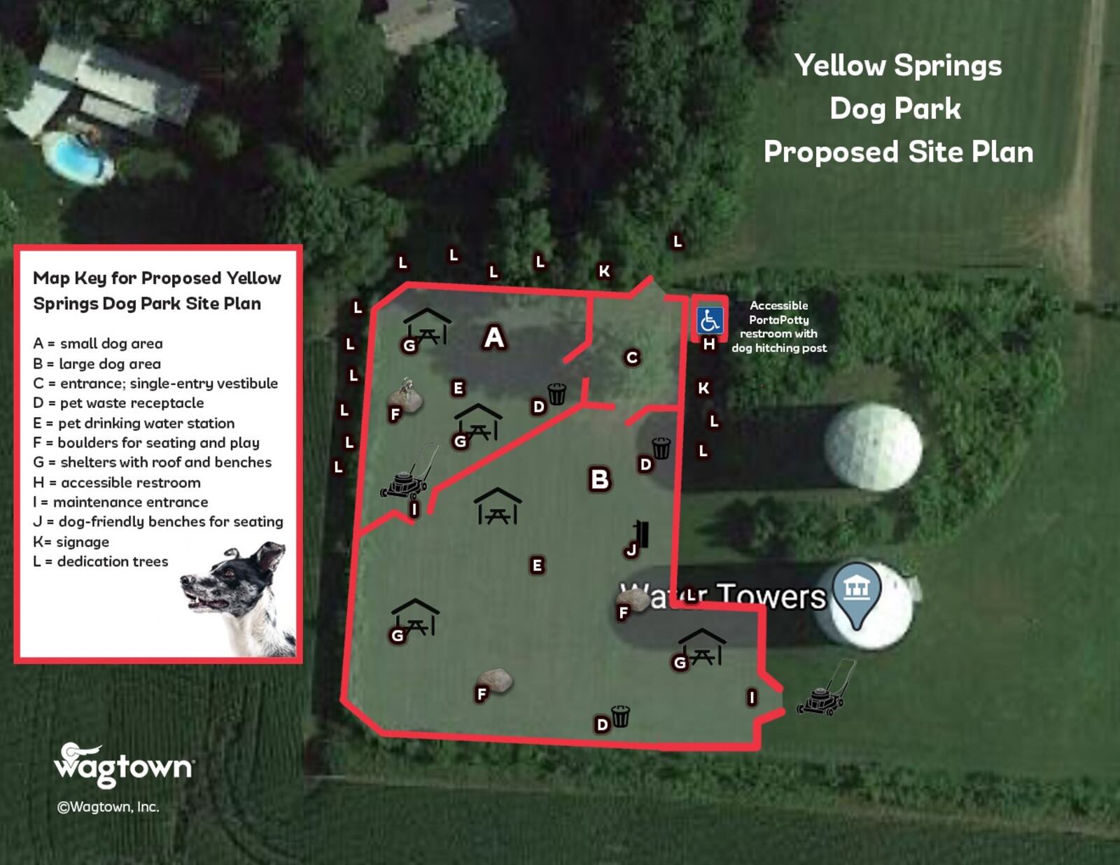 There would be a small dog area and a large dog area. There will also be a vestibule area before dog-owners get into the dog park, where they can take leashes off or put them on. Near the vestibule there will be a kiosk with information about the dog park and future events or updates.
