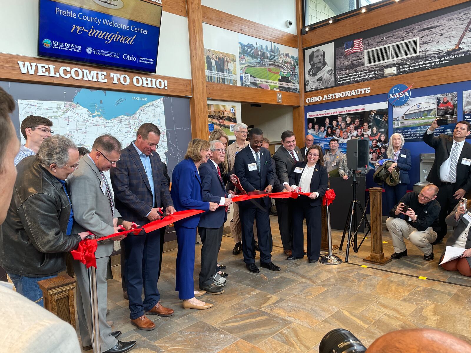 Ohio Governor Mike DeWine, First Lady Fran DeWine, Ohio Department of Transportation director Jack Marchbanks, and Ohio Department of Development director Lydia Mihalik unveiled the re-imagined Welcome Center on I-70 eastbound in Preble County and announced the plan to replace 33 rest area buildings over the next four years. SAMANTHA WILDOW\STAFF