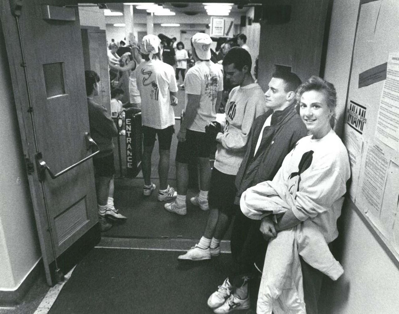 Waiting on the weights, Miami junior Mike Ryan and senior Elizabeth Manko stand in line outside the exercise room Feb. 23, 1990. It is generally a 15 minute wait. Journal-News File Photo