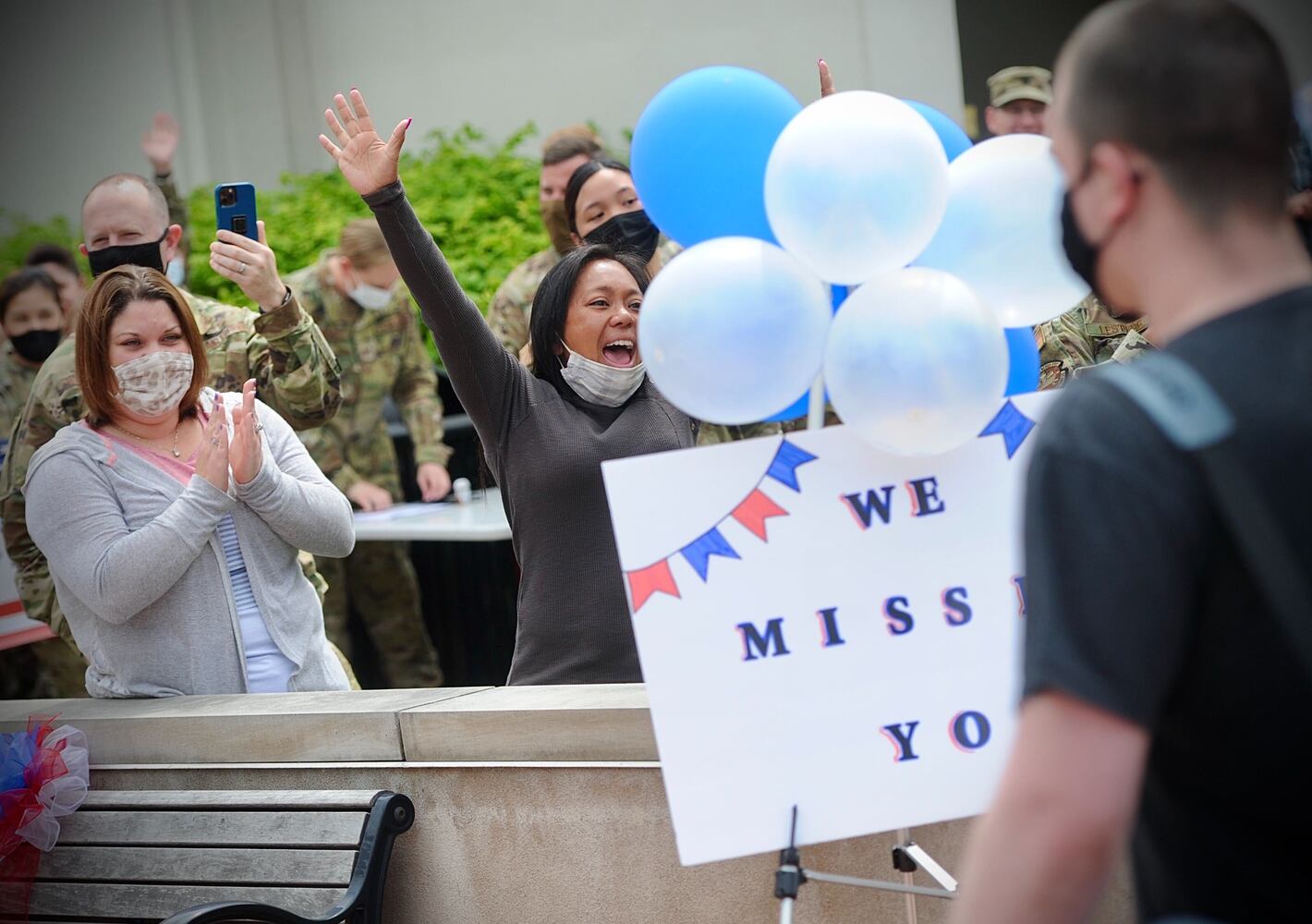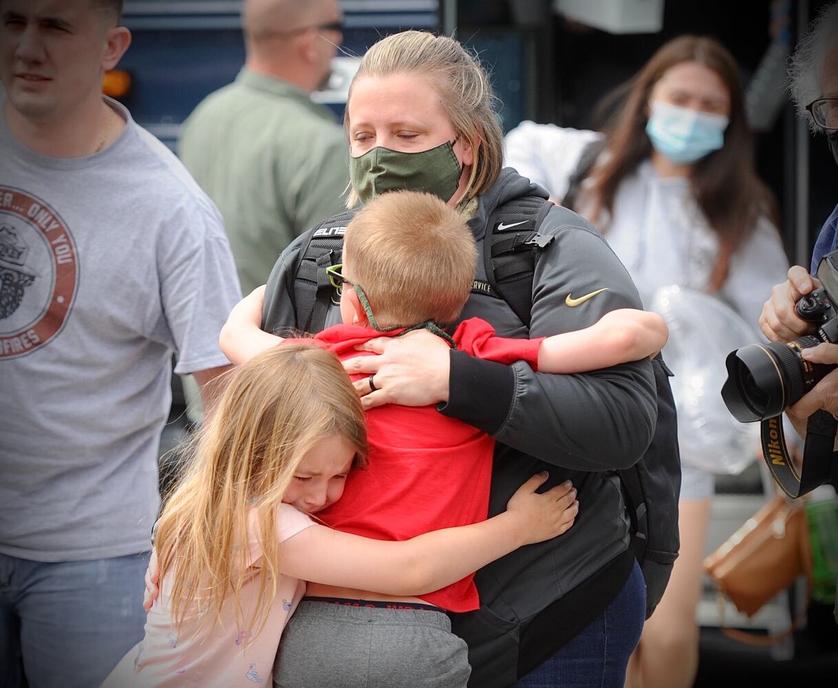 Major Erica Eyer, Receives hugs from two of her children Reagan, 8 and Brent, 5, After a two-month deployment administering COVID-19 vaccines in Michigan, Wright-Patterson Air Force Base Medical staff returned home Tuesday afternoon.