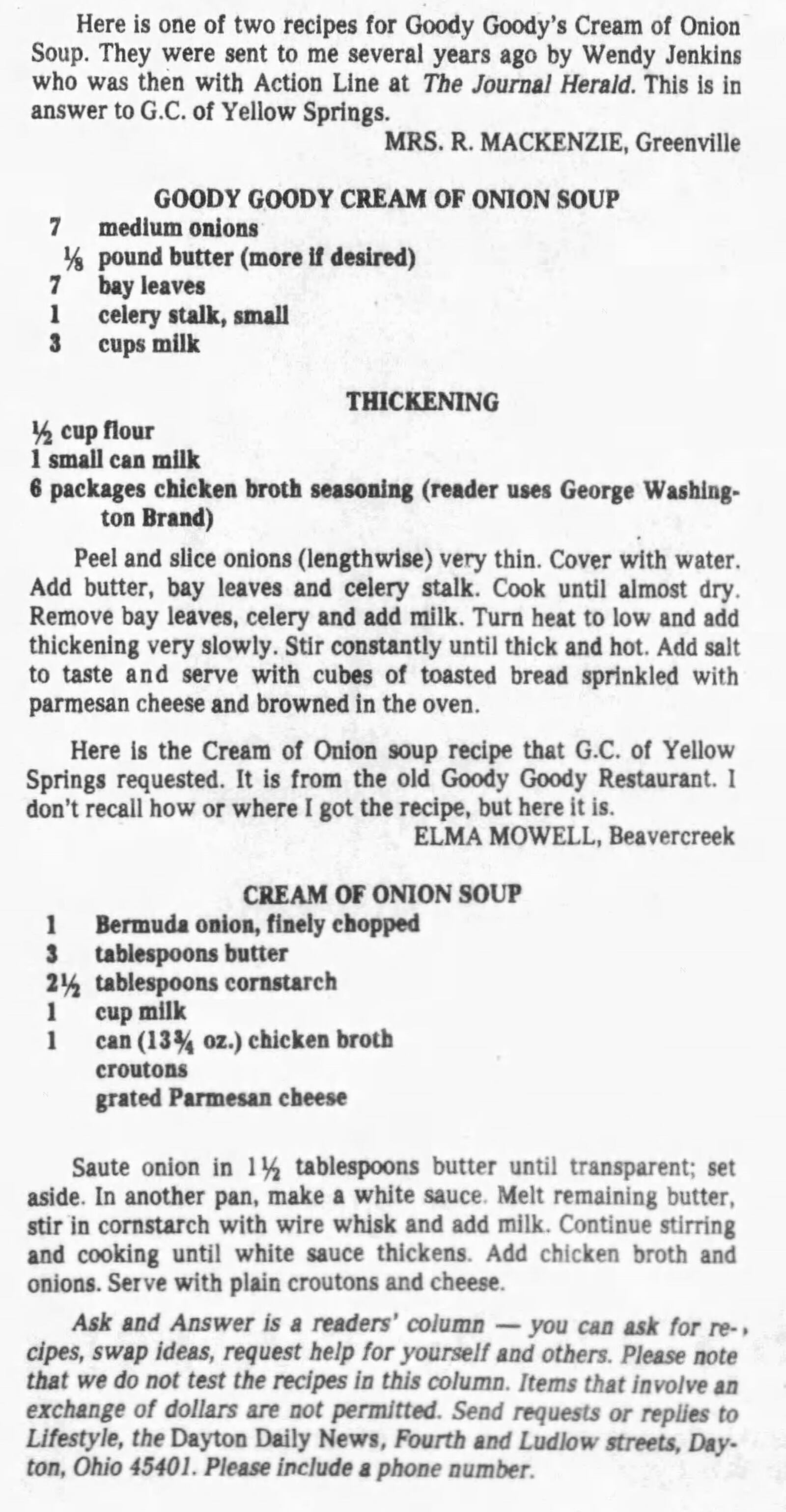 In 1976 he introduced what he had hoped would be the first of a large line of foods packaged for grocery stores. It was a 12-ounce package of onion soup, made from Goody Goody’s old family recipe.