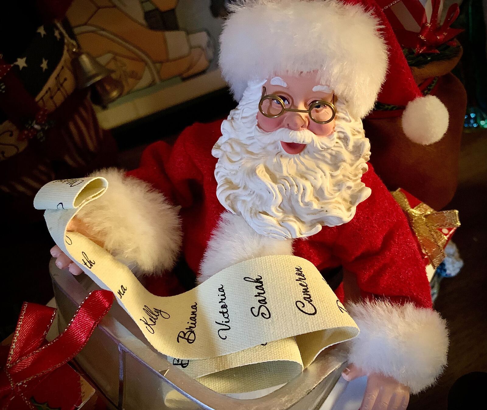 Patriotic Santa is dressed in red, white and blue. Cowboy Santa is the size of a toddler. One Santa holds a huge stack of Christmas letters, another is a Humpty Dumpty Santa painted on a real egg. Dr. Santa is taking care of an elf and handing out COVID masks. Upside down Santa, stuck in a chimney, cries out for help, All we can see is the bottom of his boots!