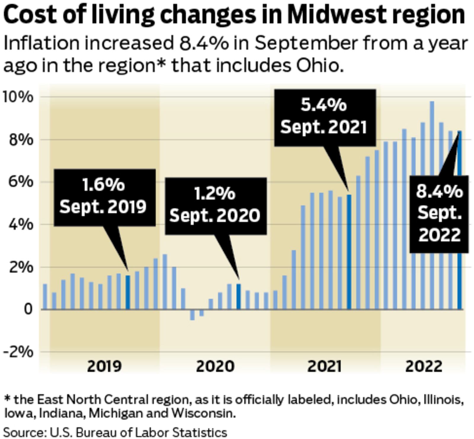 Last month, inflation jumped 8.4% from one year ago in the Midwest region that includes Ohio and four other states, the bureau said. The regional inflation rate did not budge from August.