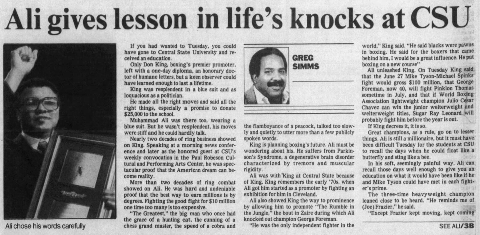 Muhammad Ali and boxing promoter Don King were at Central State University as honored guests at CSU’s weekly convocation.