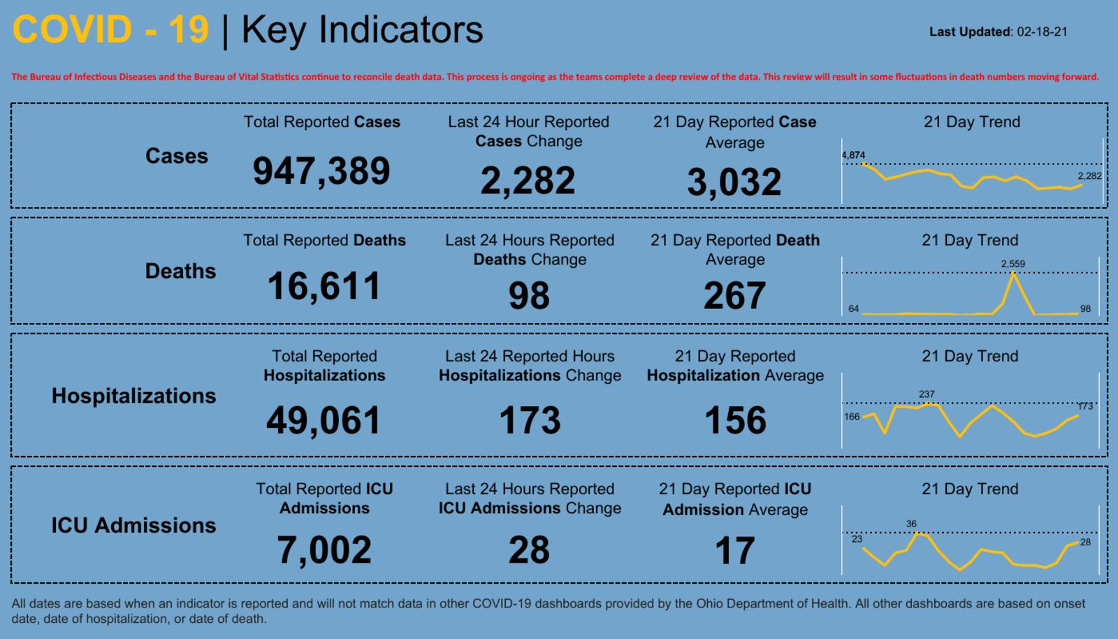 Just under 100 deaths were reported as ODH continues to reconcile data. The state recently discovered 4,000 coronavirus-related deaths at then of 2020 that previously were not included in the COVID-19 data. The state health department is working to complete a thorough review of the data, which could result in fluctuations moving forward.