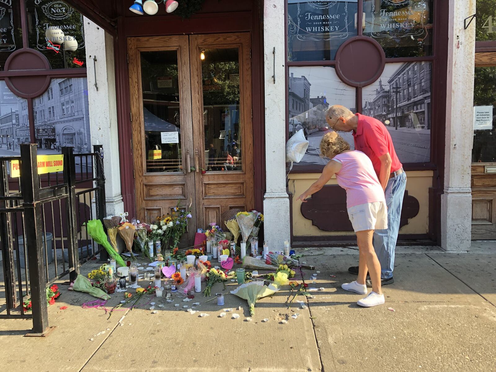 Mary Jo and Bill Kochmar found themselves in the Oregon District early Monday. The couple came to East Fifth Street to place and light a candle in front of Ned Peppers, adding to the growing memorial.