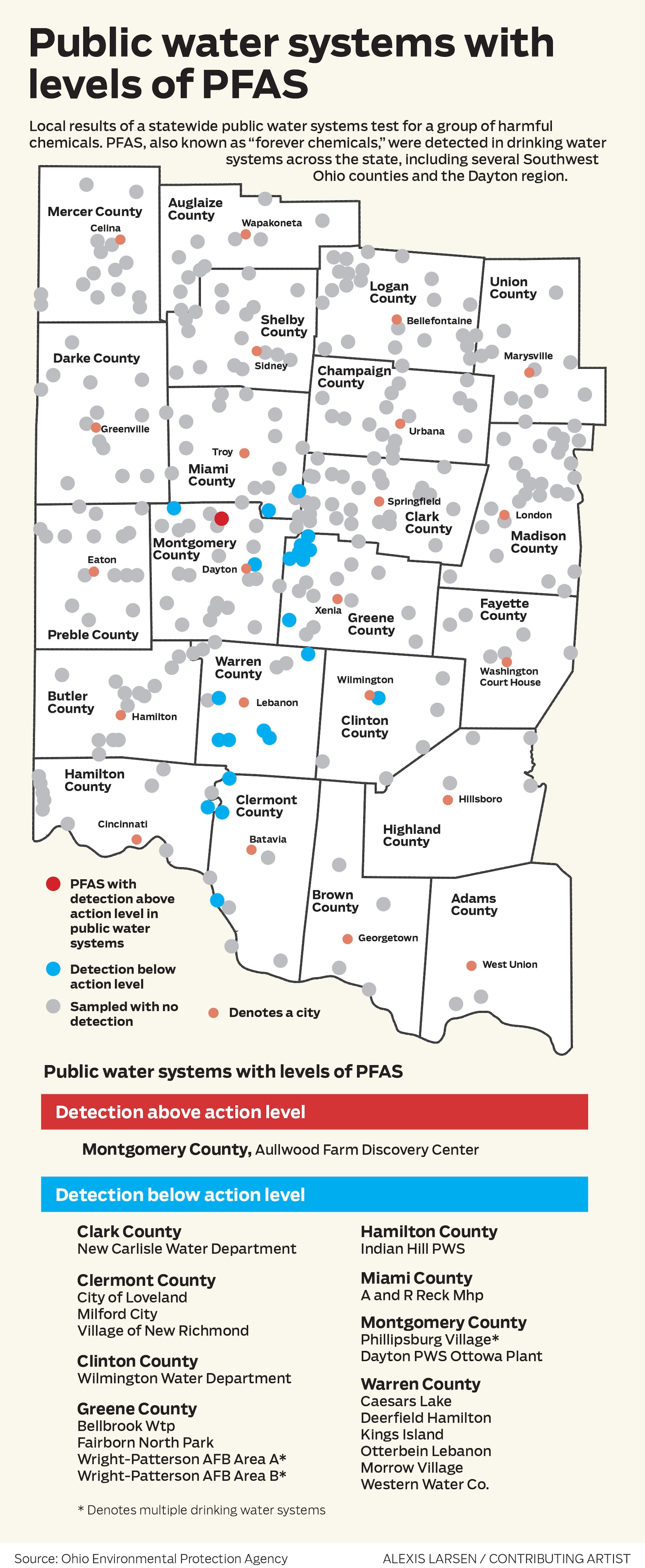 Low levels of the contaminants were detected in 24 Southwest Ohio public water systems in counties such as Greene, Montgomery, Clark and Warren, according to the Ohio Environmental Protection Agency.