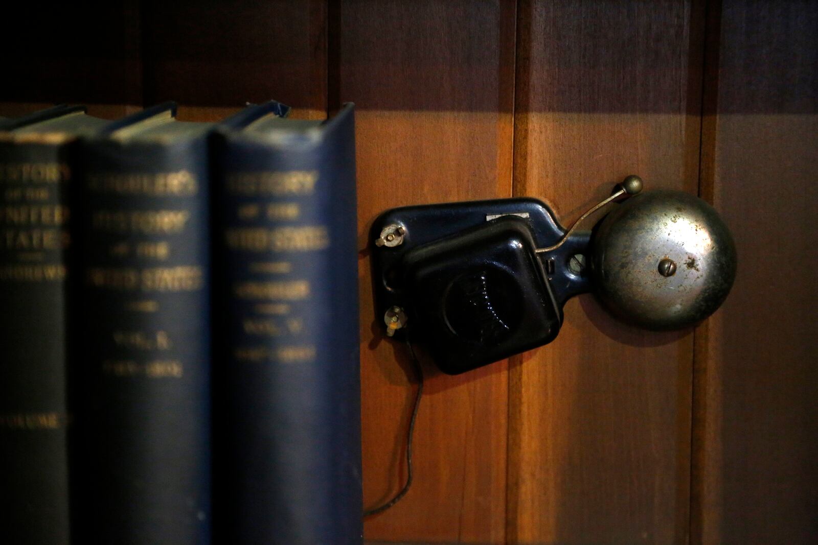The last bit of tinkering. Tucked behind the volumes on the lowest bookshelf in the library is the doorbell connected to the front door. Wright was tinkering with the buzzer connected to that bell on the day he suffered his second heart attack on Jan. 27, 1948. Witnesses that day said Orville was racing up and down steps between his basement workshop and the first floor while fixing the doorbell. He died at Miami Valley Hospital three days later.