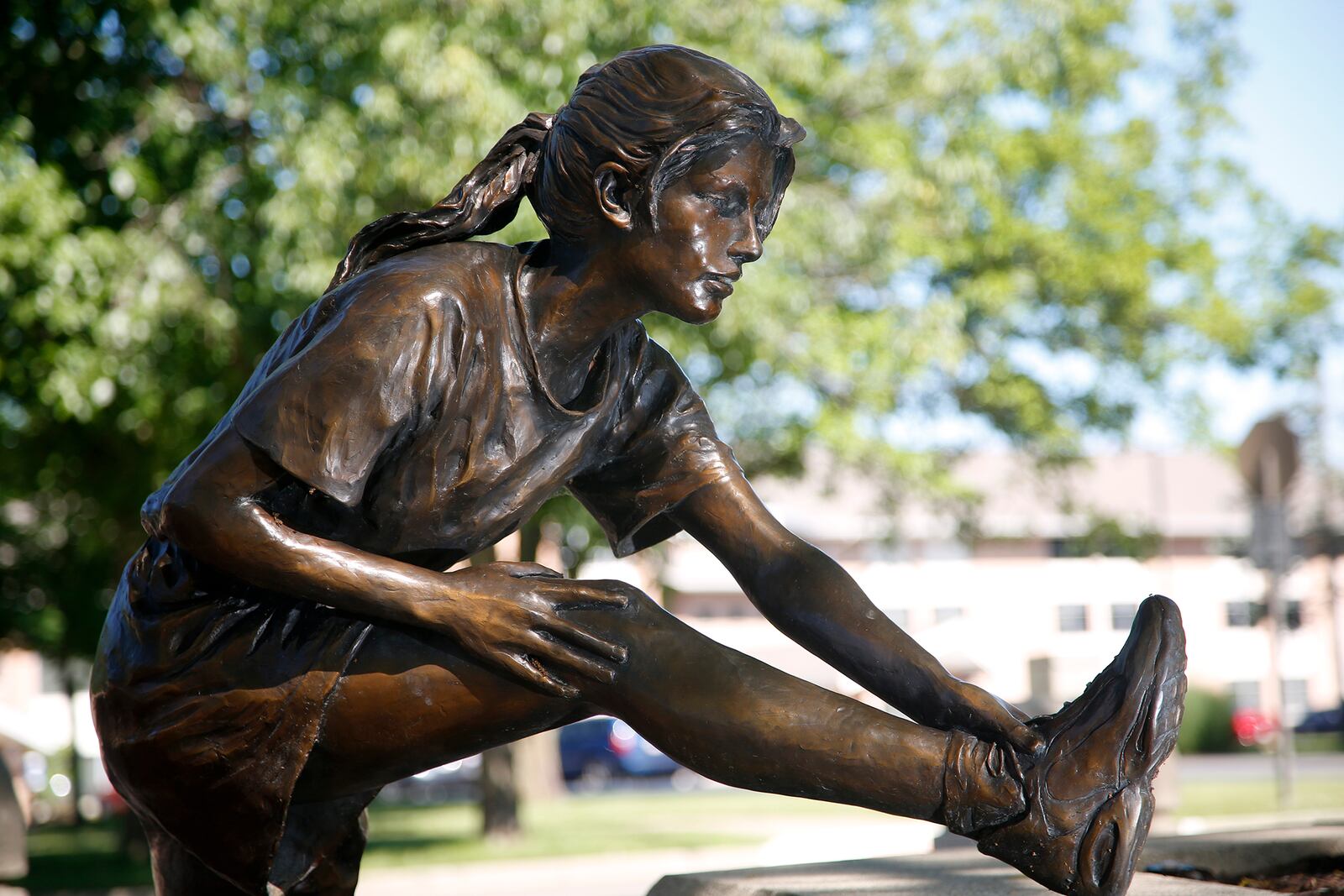 “The Runner” depicts a young woman stretching, leg propped up along a wall, before she takes off on a jog.