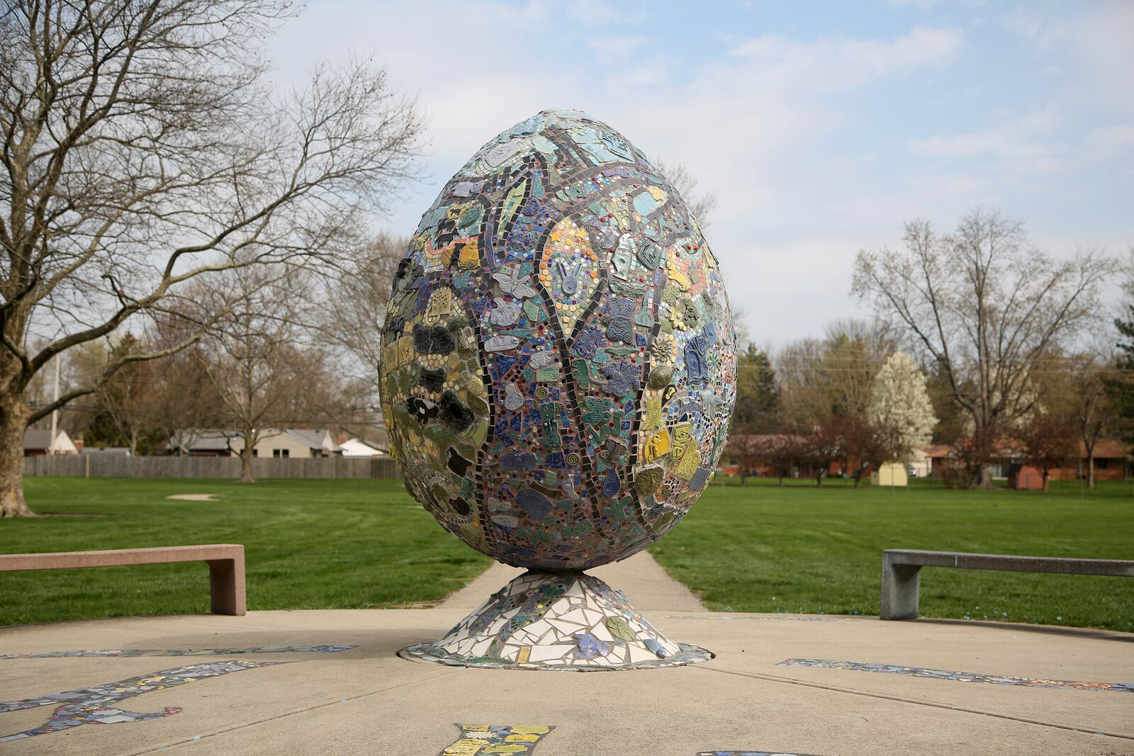 Nearby at J.F. Kennedy Park is “EGG” by Yellow Springs artists Beth Hoyoke and Käthi Seidl. “EGG,” made from 1,500 mosaic tiles created by 500 community members, reflects memories of Polen Farm and the surrounding park.