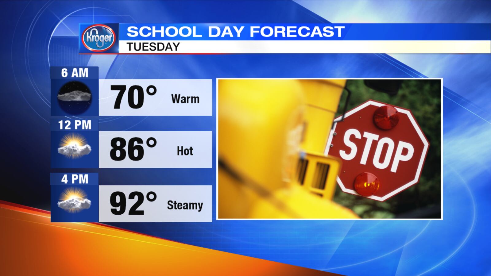Tuesday: Highs return to the lower 90s. It will be another muggy day with heat index values in the lower to middle 90s. Sun and some scattered clouds are expected.