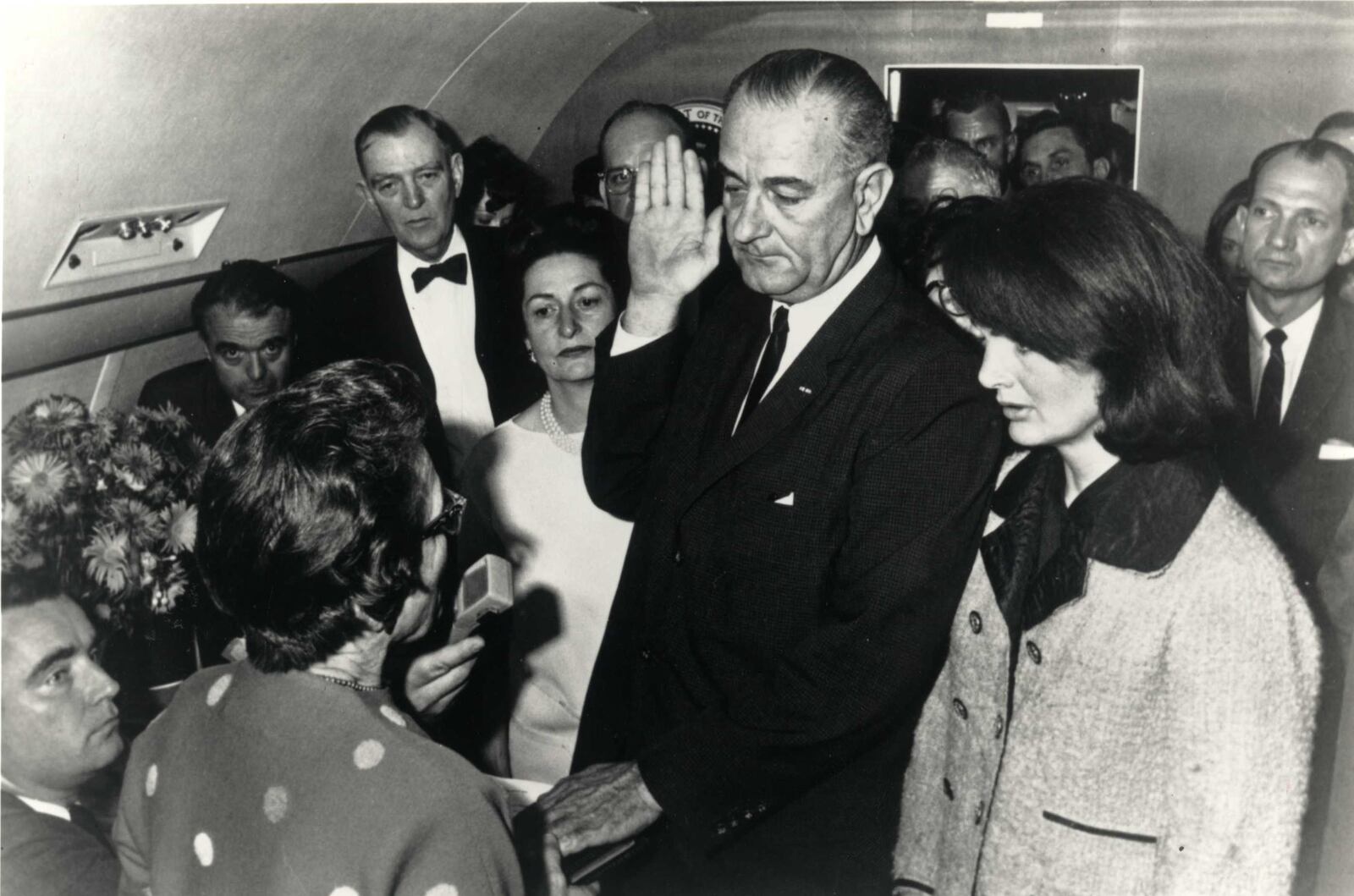 In one of the most famous photographs in American political history, Johnson is surrounded by onlookers as he raises his right hand, his left hand on a Catholic missal, to take the oath of office in the cramped cabin. Jackie Kennedy stood next to Johnson. She was still wearing the pink dress streaked and stained with her husband’s blood, Davis said.