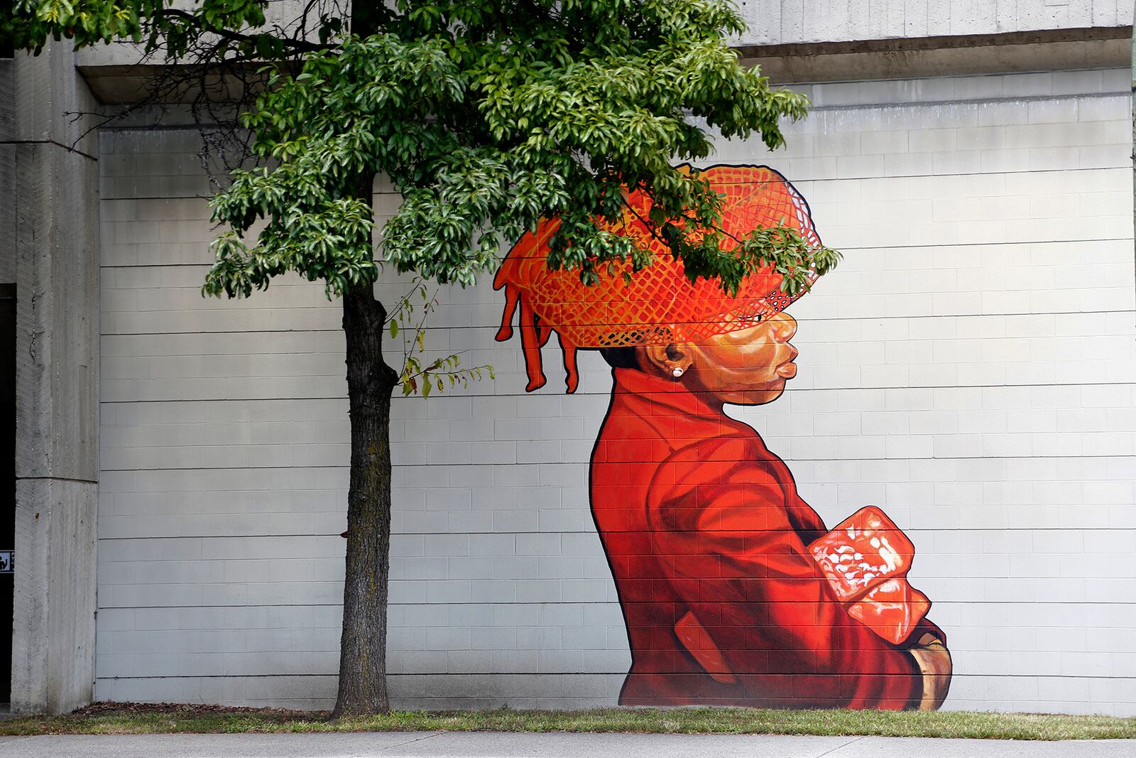 A regal woman, holding a clutch under her arm and wearing a veiled hat, is painted in tones of orange and red on the side of the transportation center parking garage on Fifth Street near the entrance to the Oregon District. She looms large against the concrete back drop. A red cardinal perched on a metal standpipe connector is discretely painted near her.