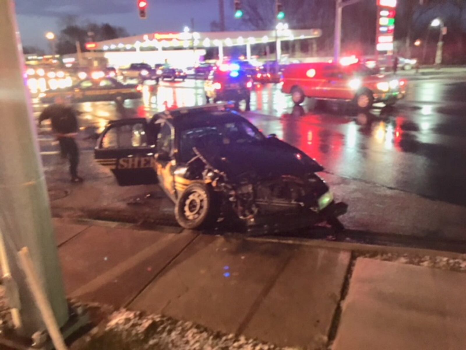Both the black SUV and cruiser had heavy front-end damage. The air bag deployed in the cruiser.