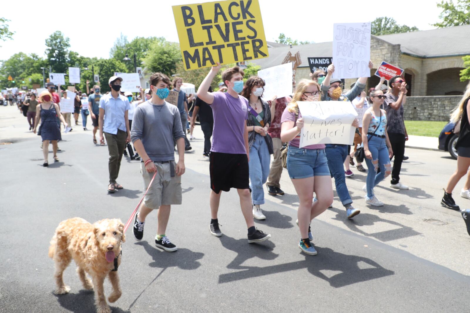 In Dayton, a crowd began growing around noon with several people holding signs that said, “Black Lives Matter,” “Everyone vs. Racism,” and “Vote.” Before the group began marching, a nine-minute moment of silence was held to represent the length of time that a Minneapolis police officer kneeled on the neck of George Floyd before he died.