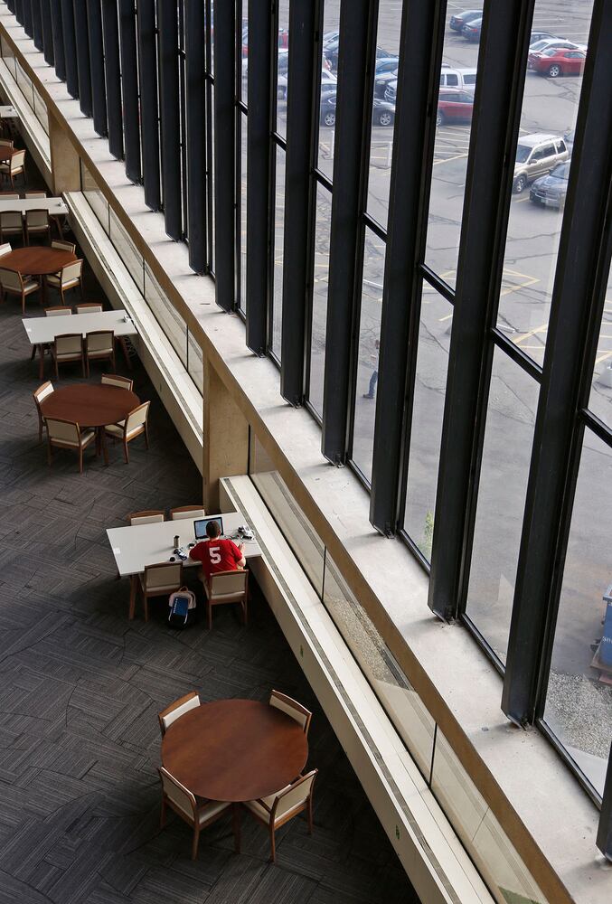Overview of the second floor in the Paul Laurence Dunbar Library at Wright State University. The library recently completed a renovation that included new furniture and carpet to replace the 30-year-old furnishings which were recycled throughout the university. TY GREENLEES / STAFF