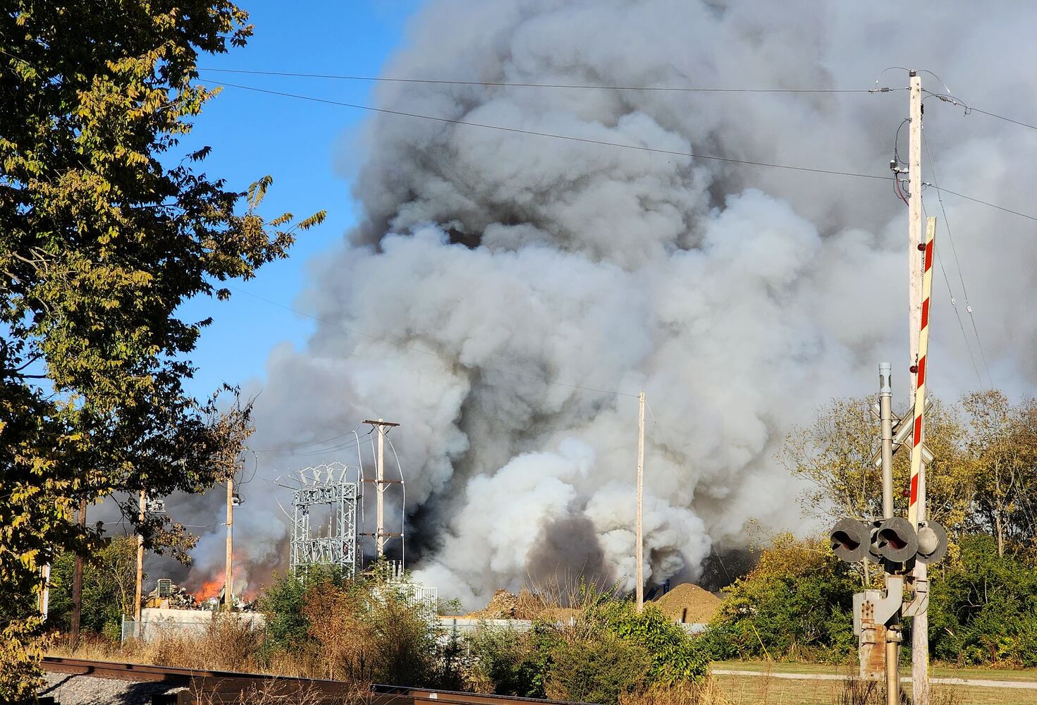 A fire that broke out Sunday at Cohen Recycling Center at 5101 Farmersville-West Carrollton Road in West Carrollton sent a huge plume of black and brown smoke billowing eastward to downtown West Carrollton and beyond. NICK GRAHAM/STAFF