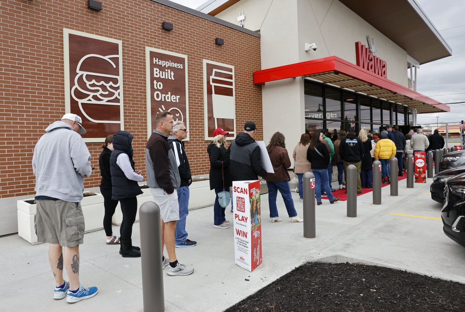 Jean and Henry Toudy, from Monroe, wait in line for a VIP event Tuesday, April 15, 2025 for Ohio's first Wawa on Cincinnati Dayton Road in Liberty Township. The grand opening is Wednesday. NICK GRAHAM/STAFF