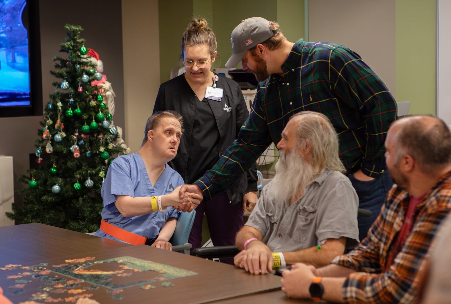 Cincinnati Bengals center and Walter Payton NFL Man of the Year nominee Ted Karras visited Kettering Health Hamilton on Tuesday, Dec. 5. Karras visited cancer patients receiving infusion, new parents with their babies, and patients in Kettering Health Hamilton’s inpatient rehab. Along with taking time to chat with patients and pose for pictures, Karras passed out hats and onesies from his company The Cincy Hat. PROVIDED/KETTERING HEALTH