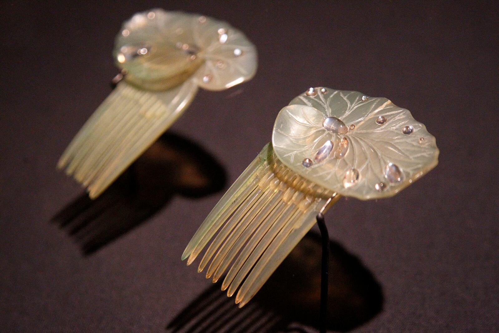 Look for curving lines and women’s hair flowing in the Art Nouveau pieces. “Rene Lalique made jewelry for people like Sarah Bernhardt; without her his jewelry would not have been so popular. It was big and erotic and nobody had ever seen anything like it in jewelry before. Some wealthy women would buy it and put it on their dresser because they were afraid to be seen in public wearing it!”